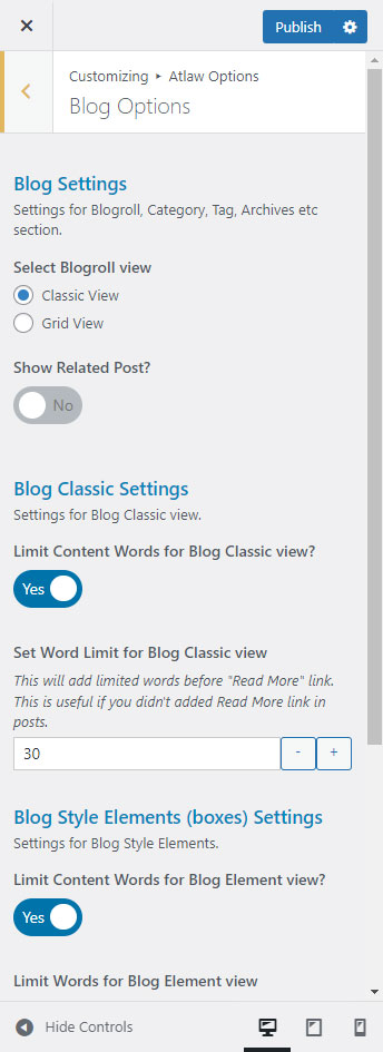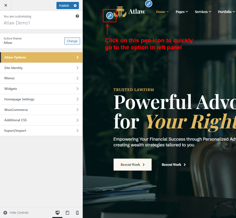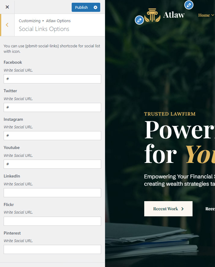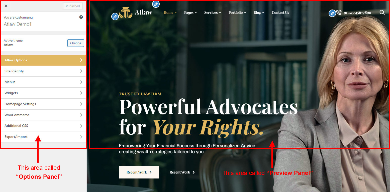 Atlaw Options (Theme Options) panel is created with WordPress' Customize section. We added our own options with WordPress' default options.