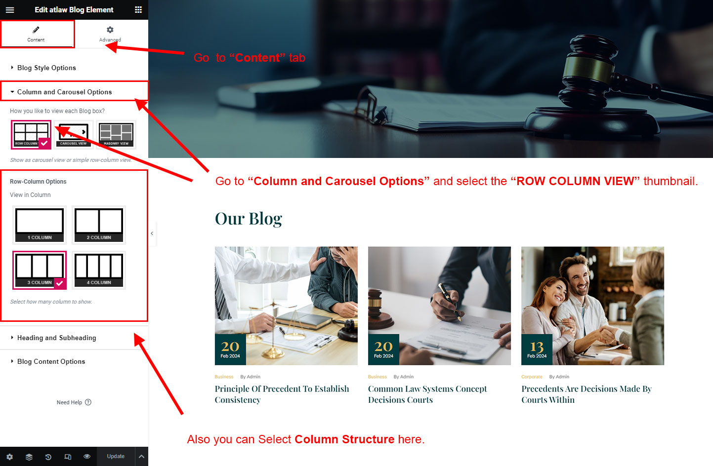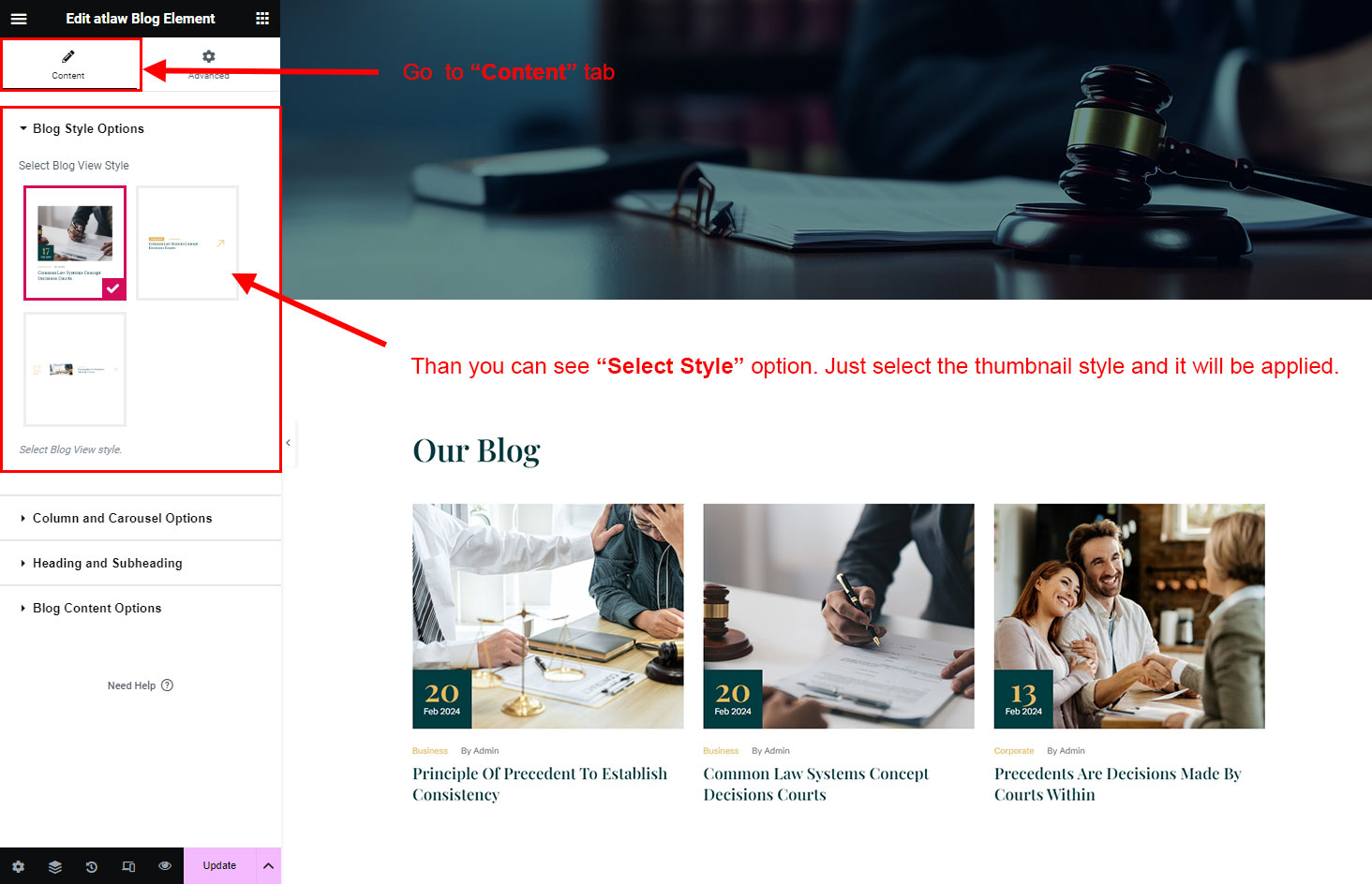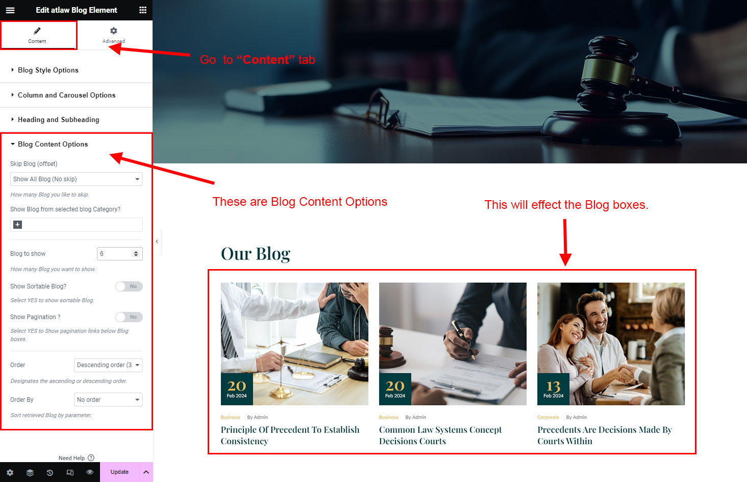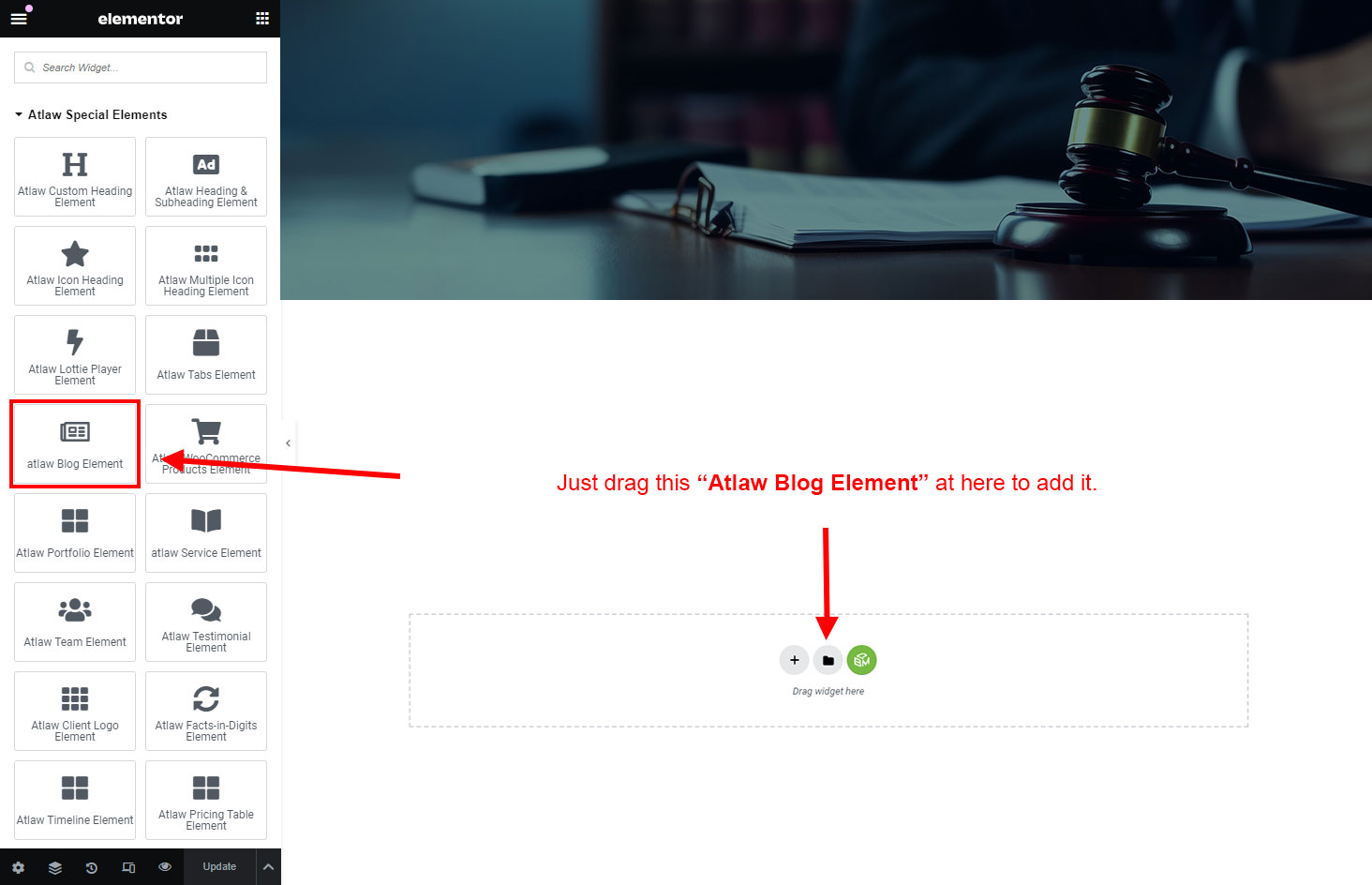We created a Blog Element in Elementor Page Builder which you can use to show post on any page you want. Just drag and drop the Atlaw Blog Element on any page and the post list will appear.