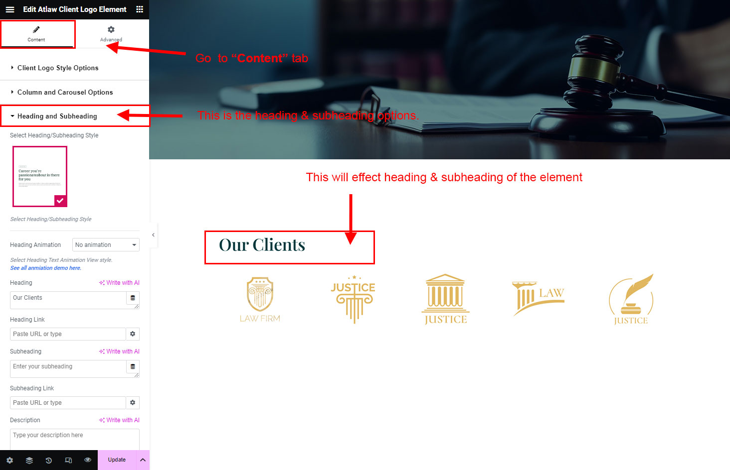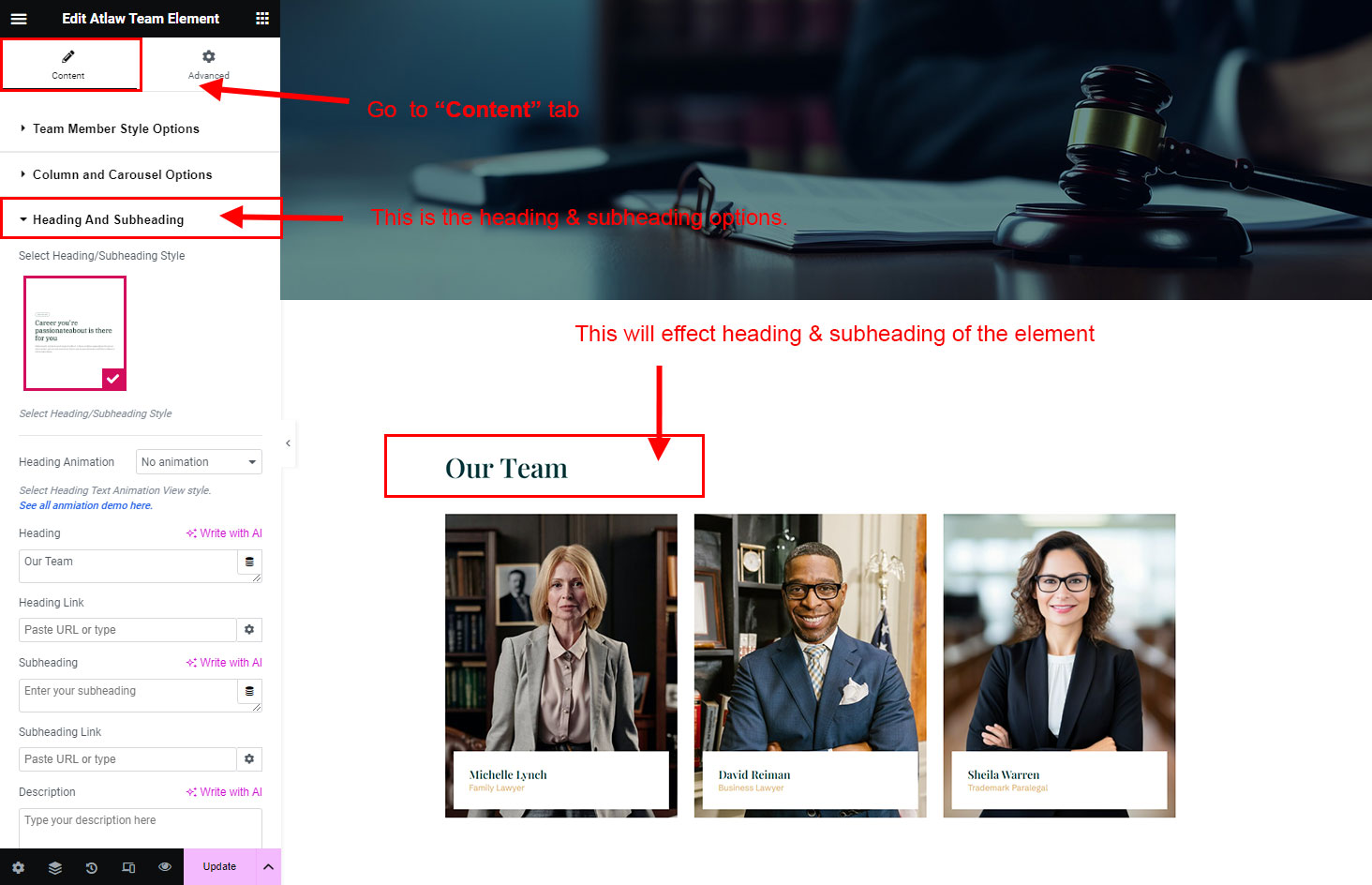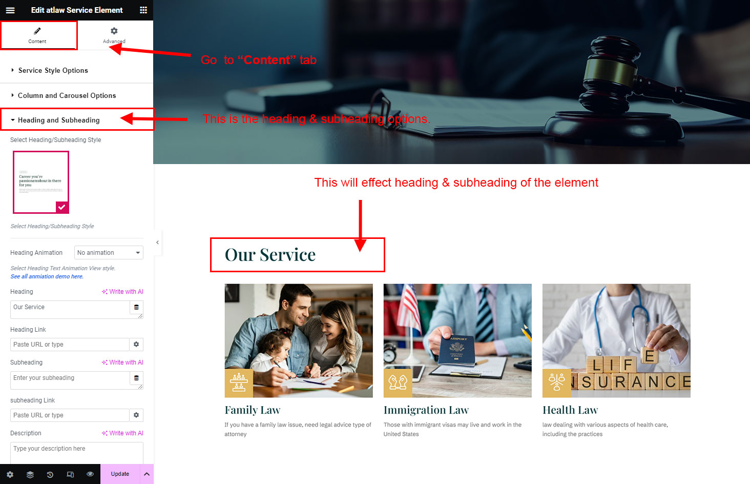 The heading and subheading will appear at top of the element. You can change text, add link to the heading or subheading, change alignment, change tag (for SEO purpose) etc.