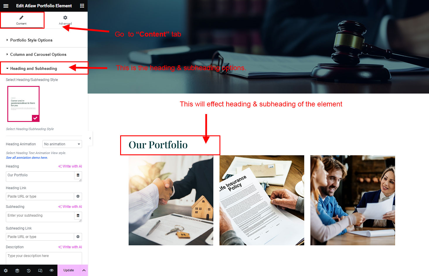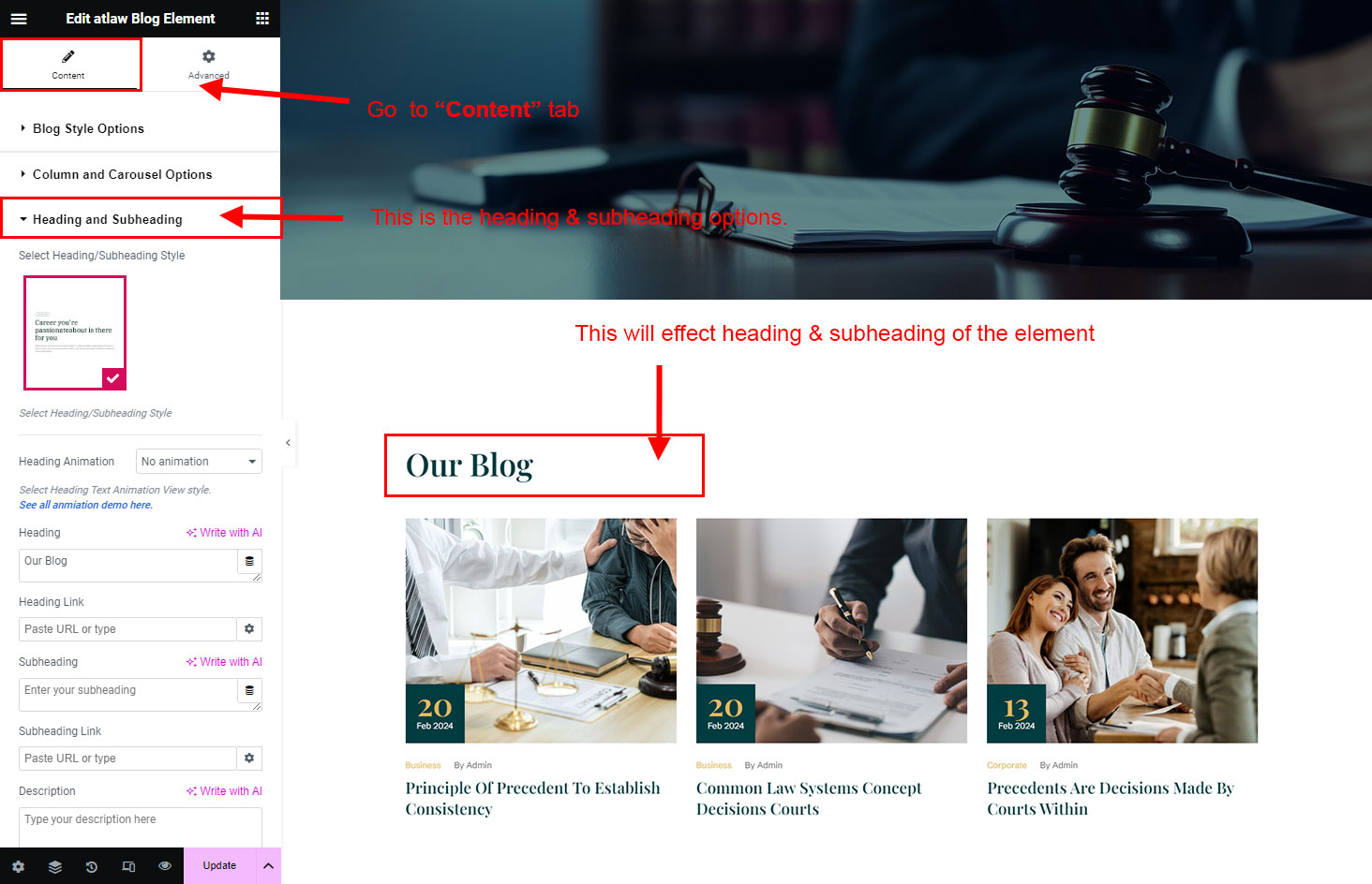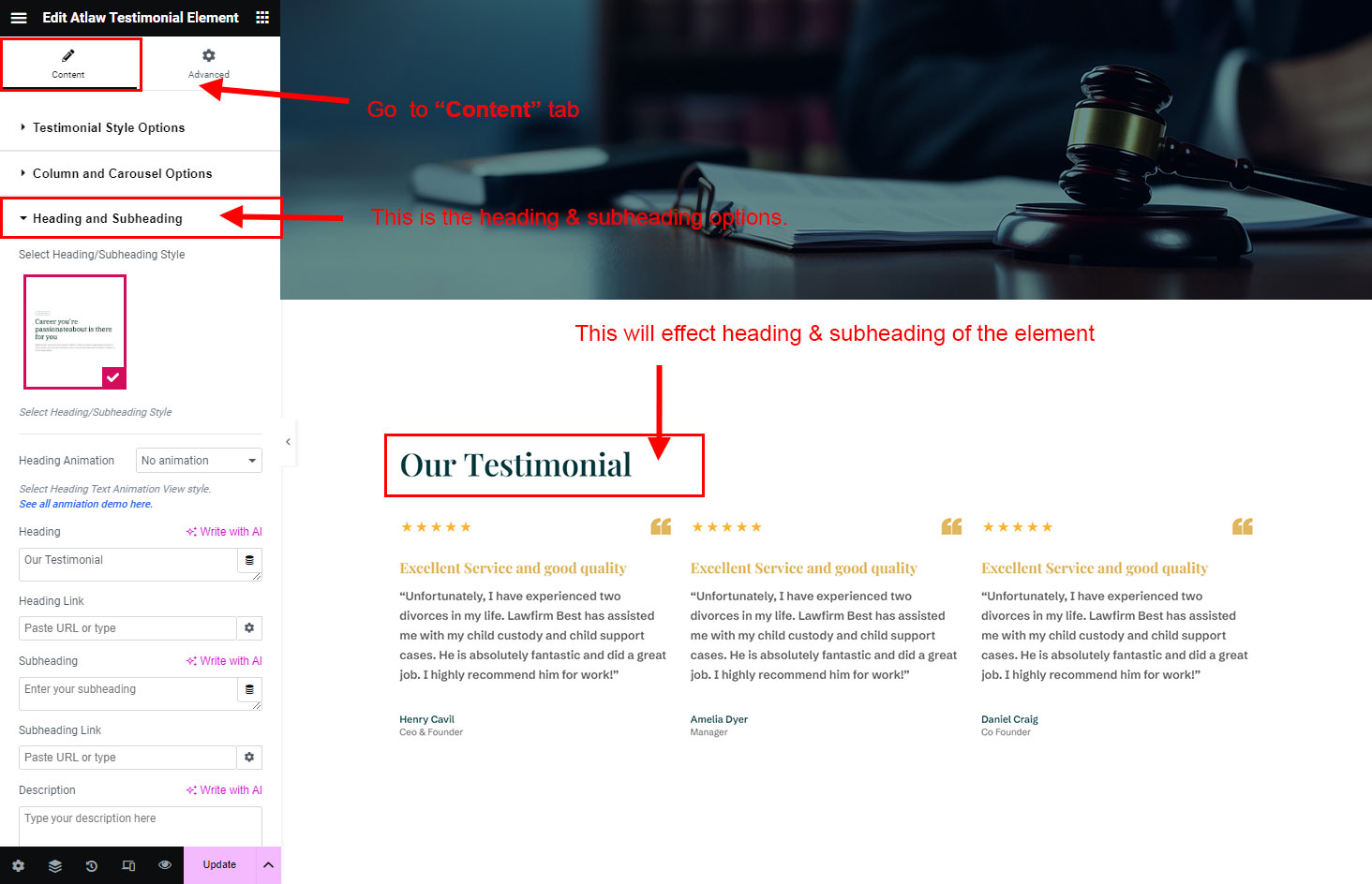 The heading and subheading will appear at top of the element. You can change text, add link to the heading or subheading, change alignment, change tag (for SEO purpose) etc.