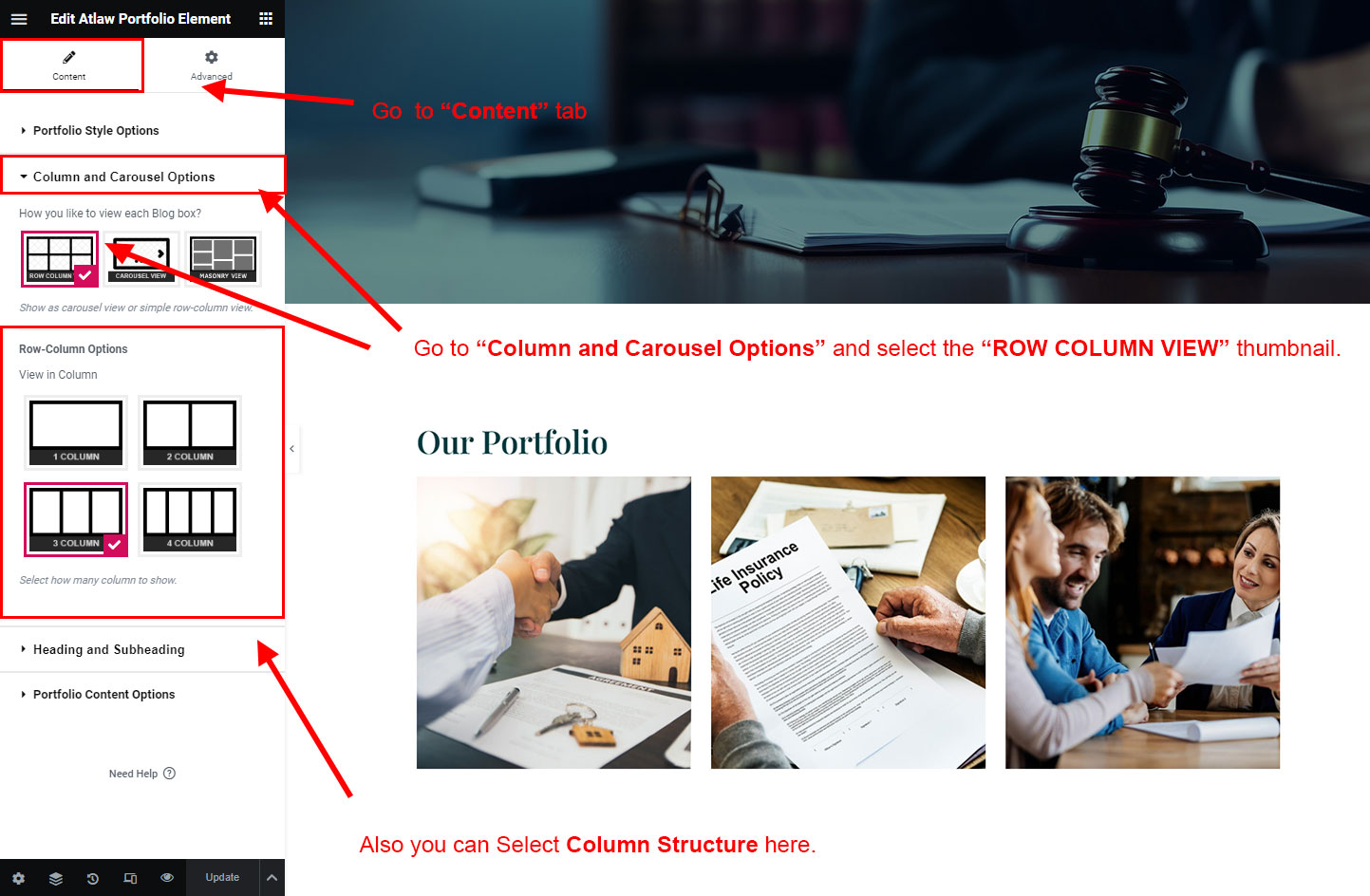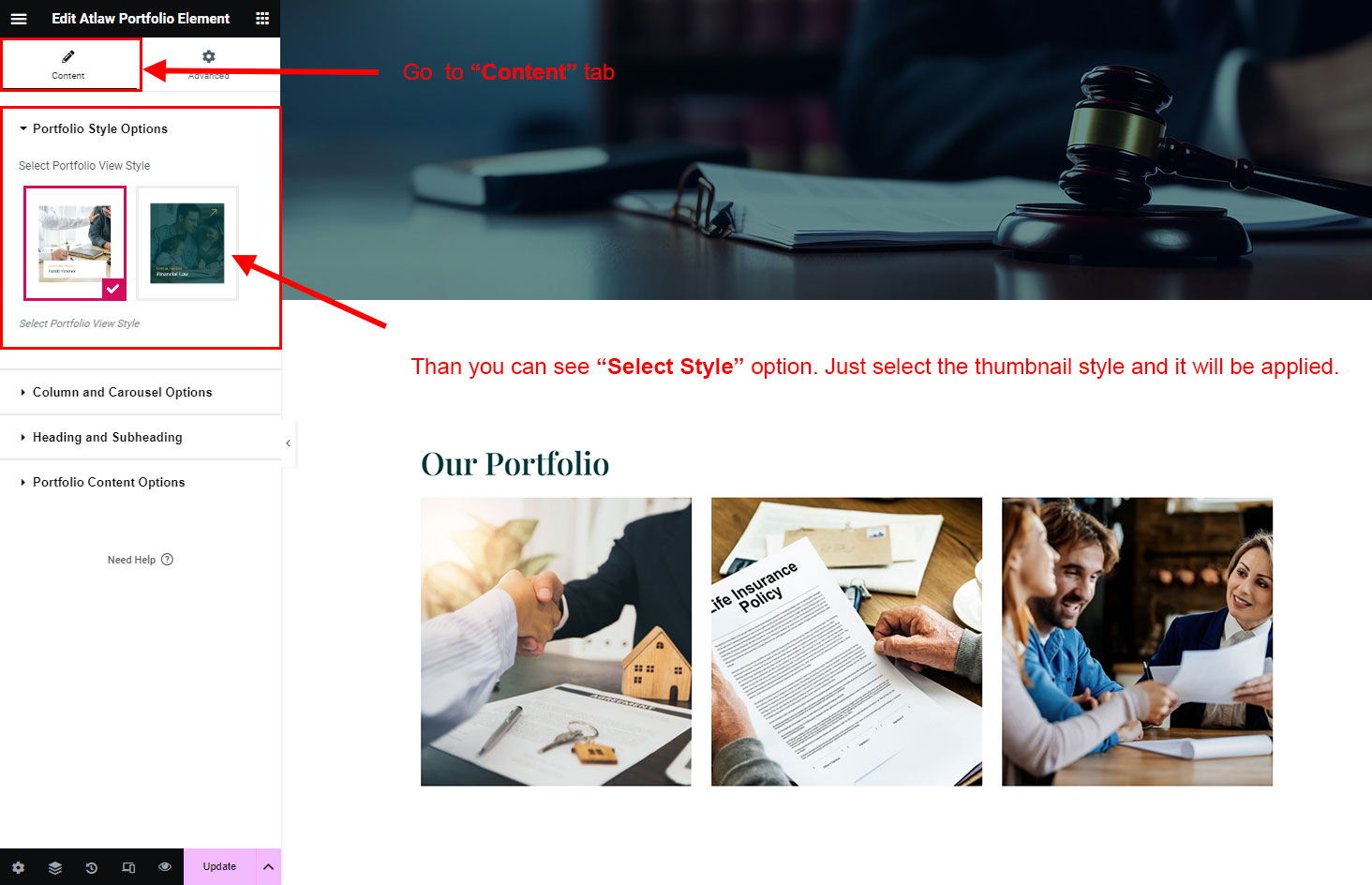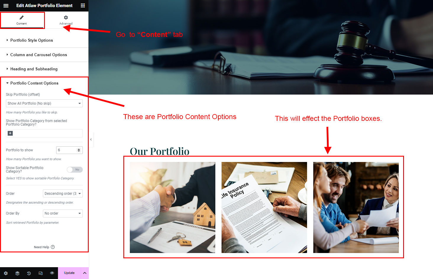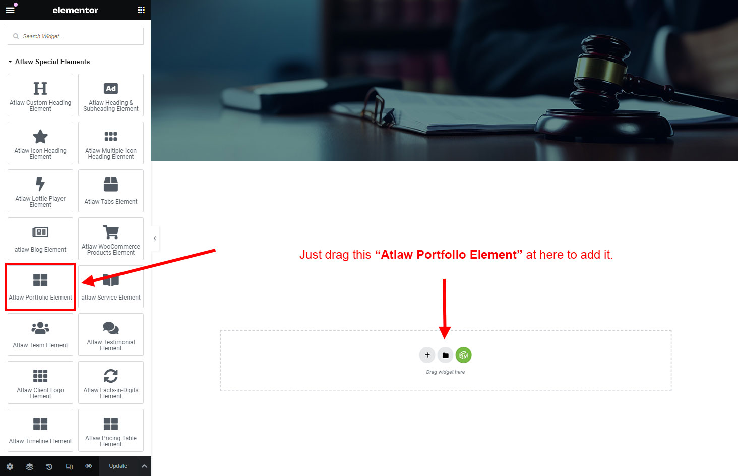 Now we have some Portfolio posts. So we can show all Portfolio on a page. Create a new page and add Atlaw Portfolio Element on a page by dragging it.