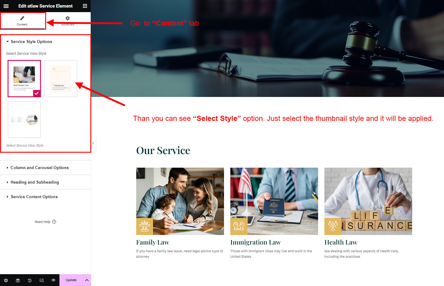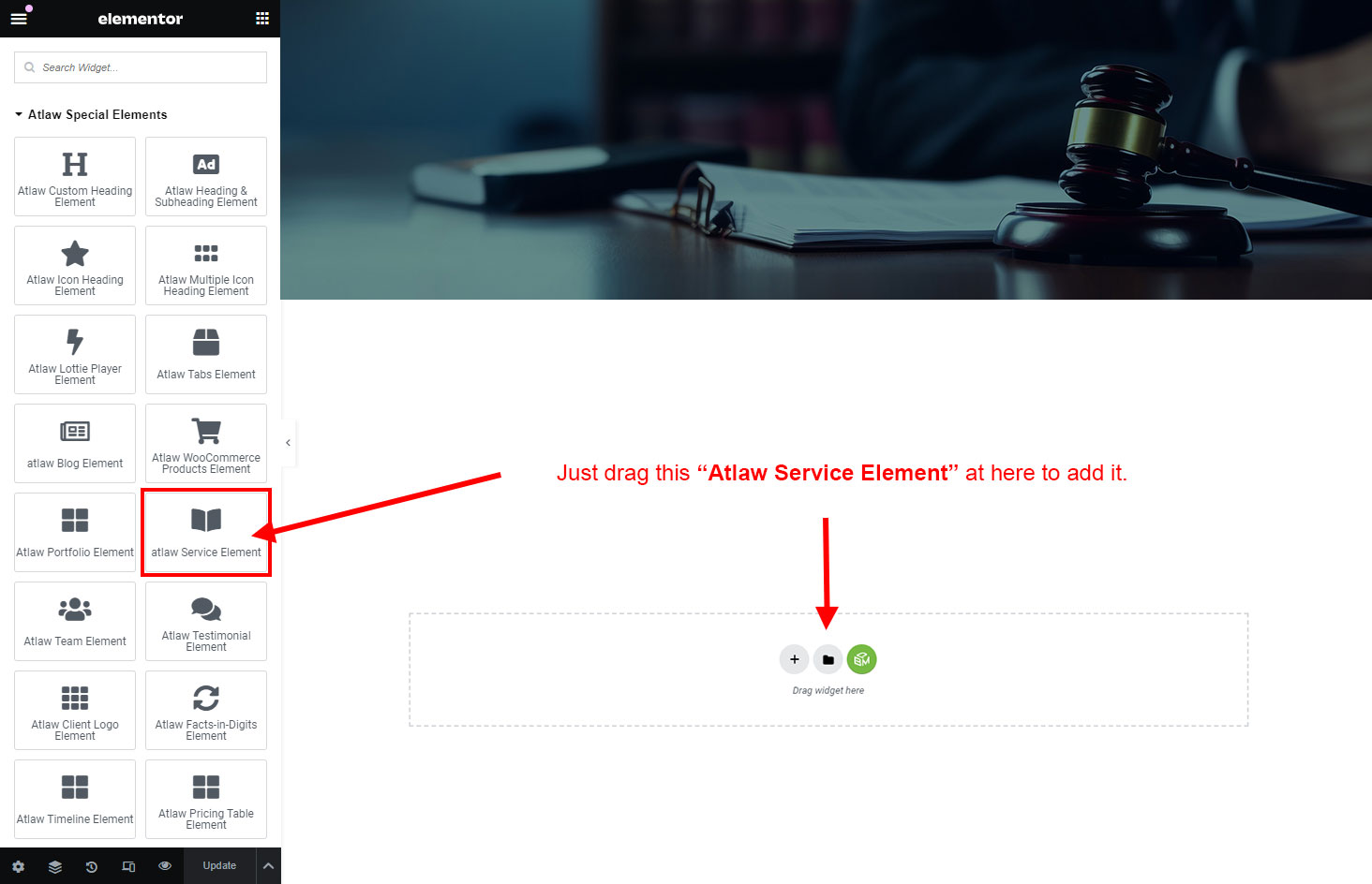 Now we have some Service posts. So we can show all Service on a page. Create a new page and add Atlaw Service Element on a page by dragging it.