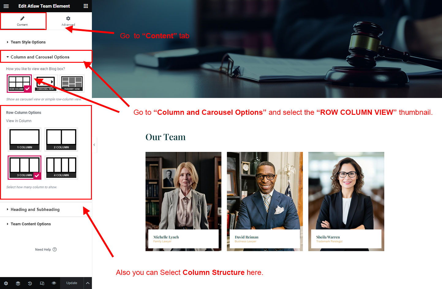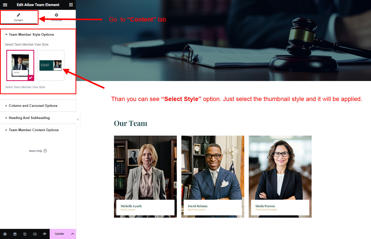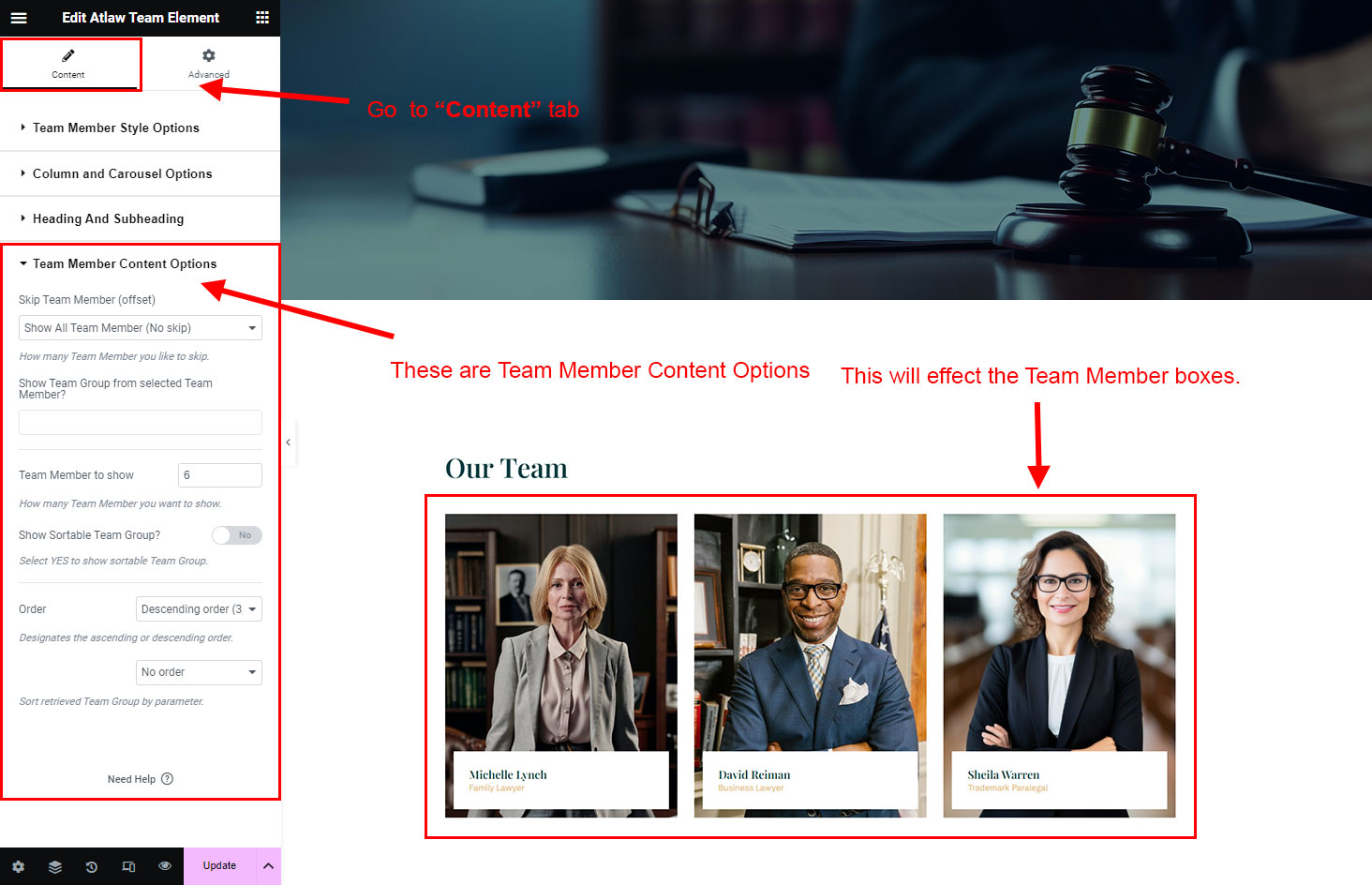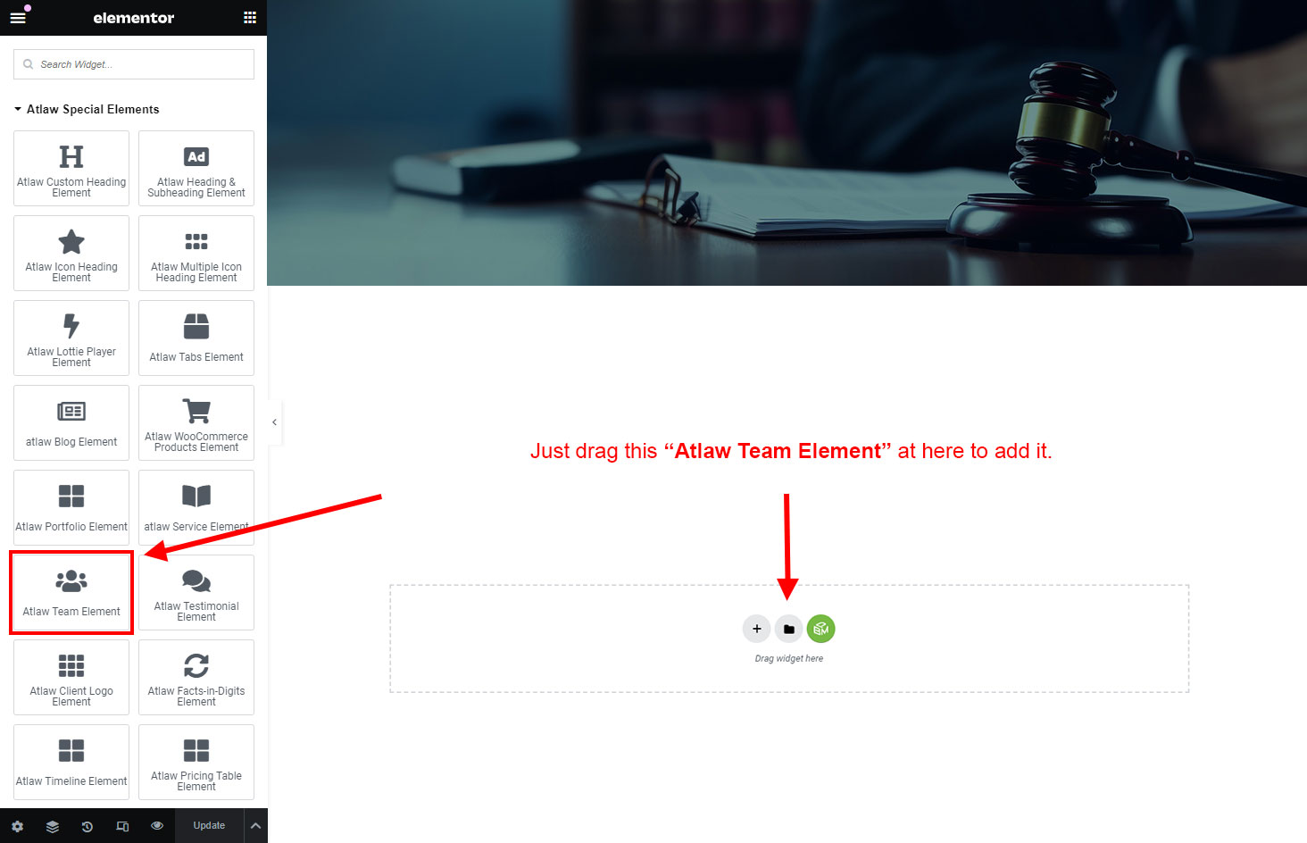 Now we have some Team posts. So we can show all Team on a page. Create a new page and add Atlaw Team Member Element on a page by dragging it.