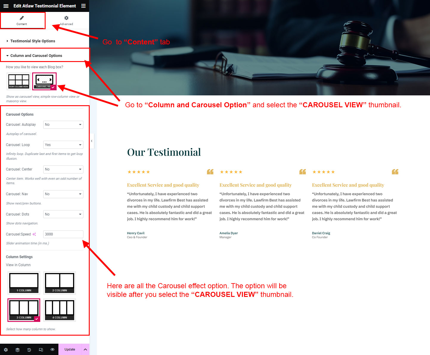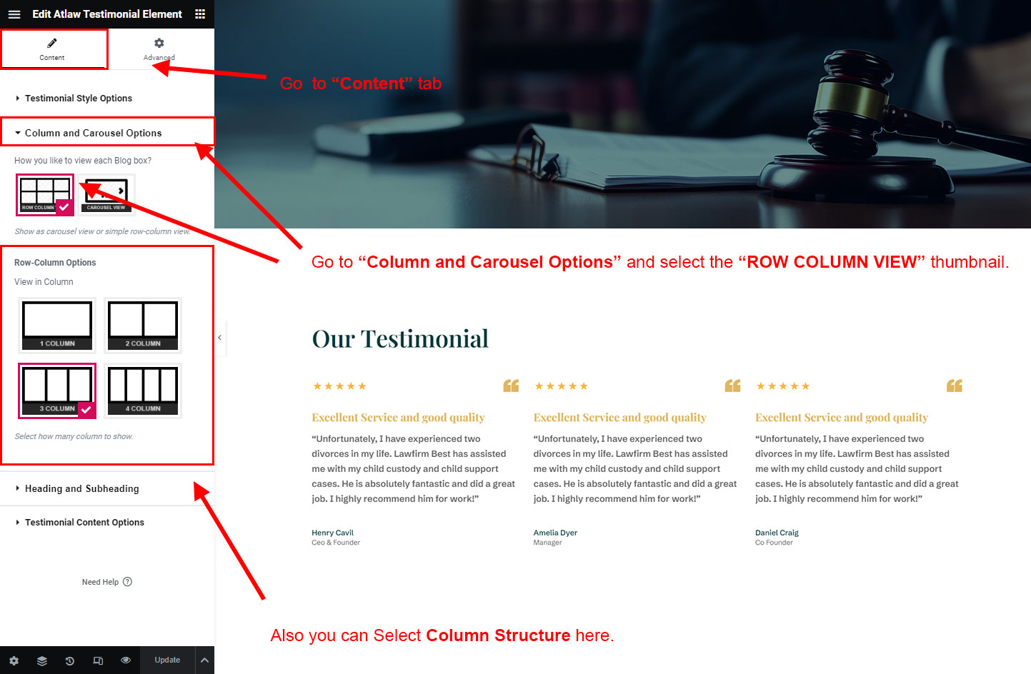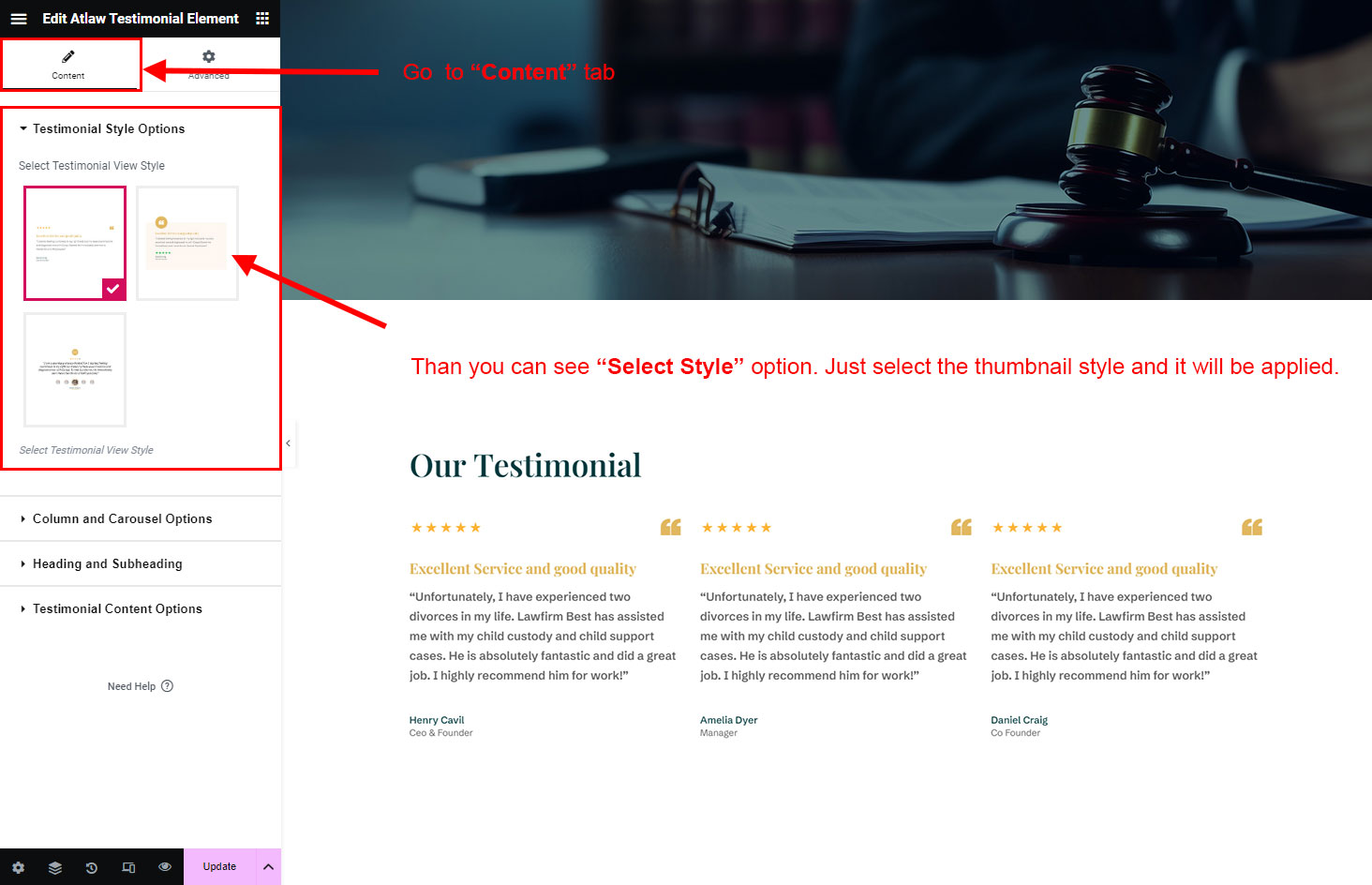 You can select the testimonial options here. Like how many testimonial you like to show, show testimonial from selected group (category), testimonial order etc.