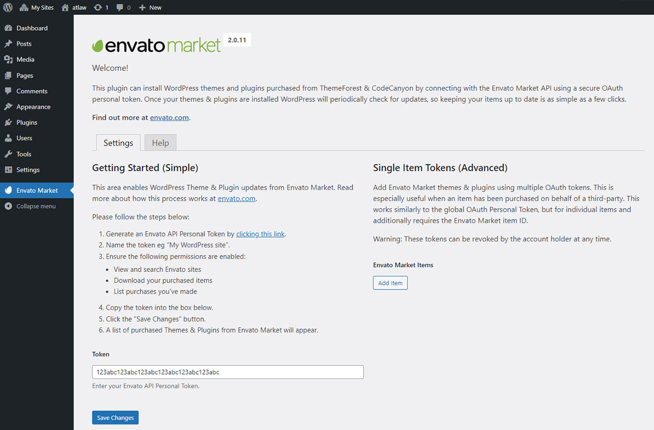 Now go back to your WordPress installation and paste in your Envato API token then click save.