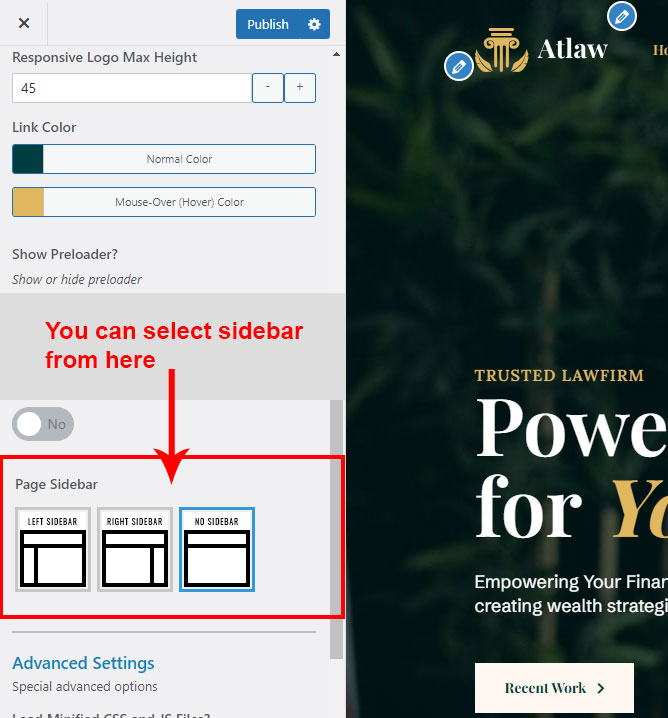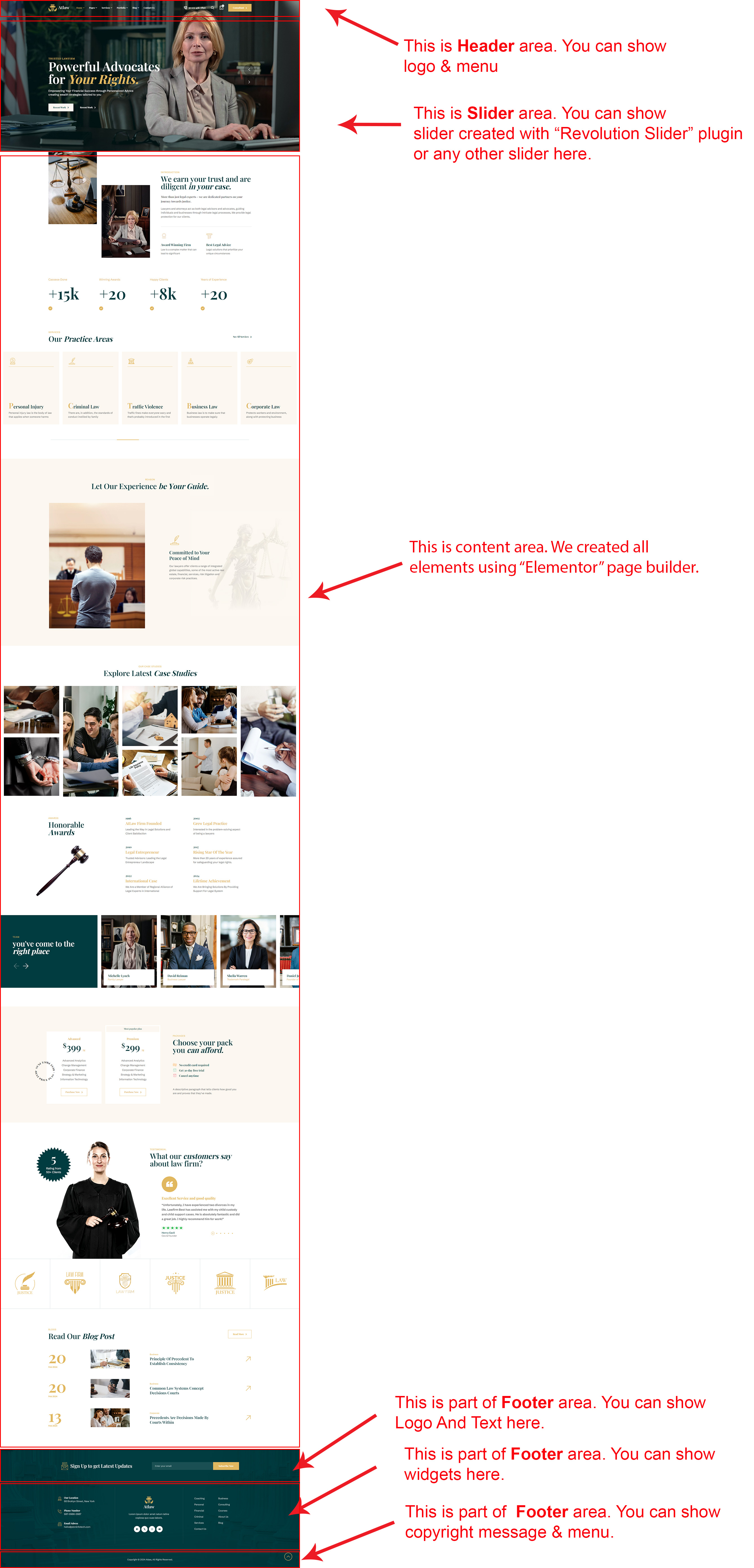 There are different sections in Atlaw theme. Here you will find name of each section name so you can find their options easily. You can customize each sections from Atlaw Options easily.