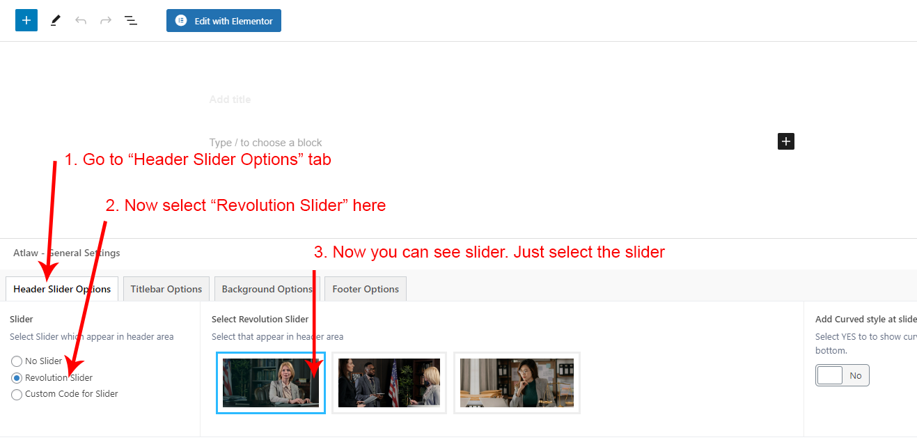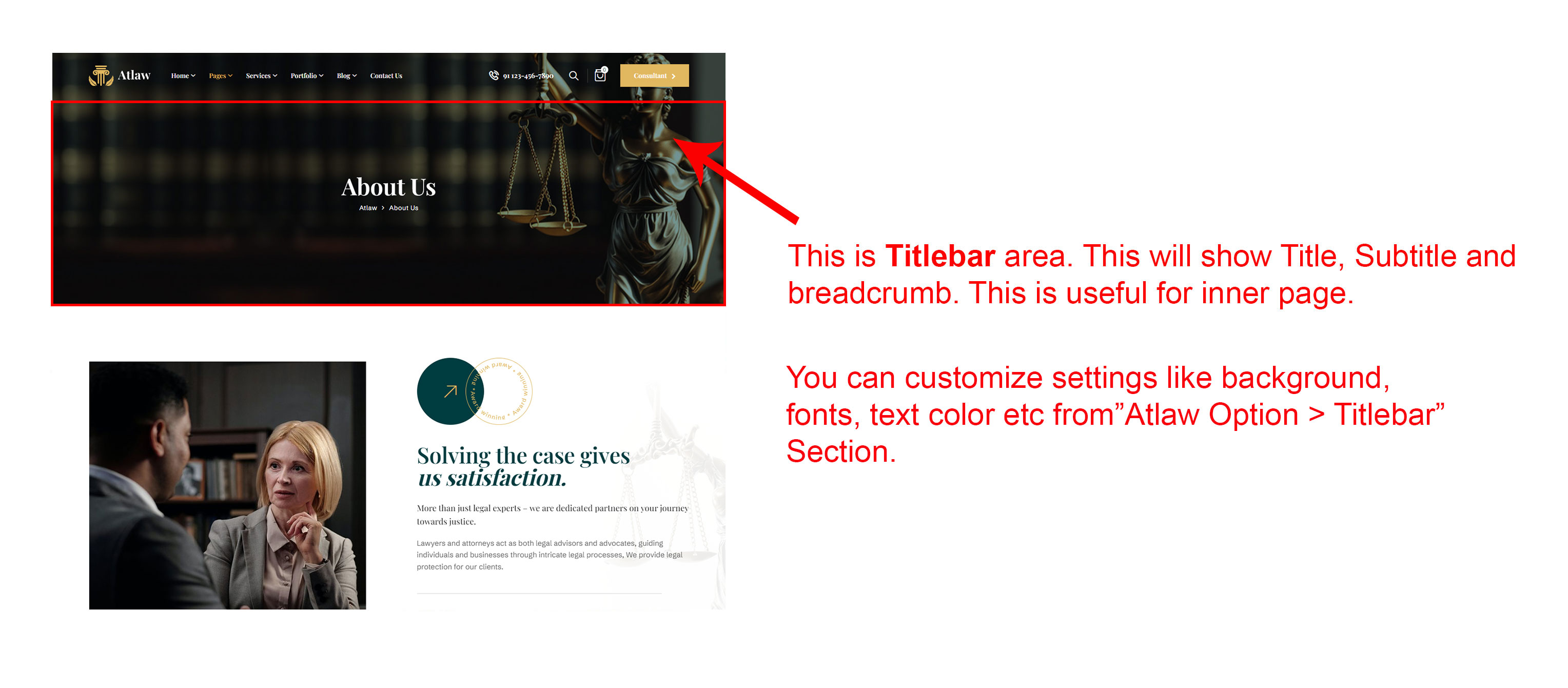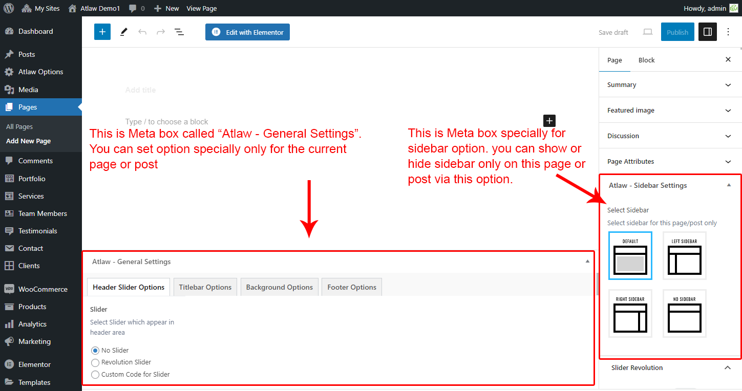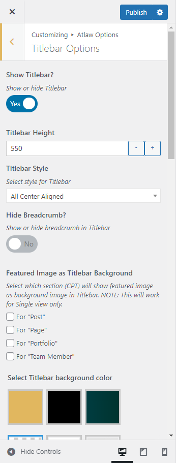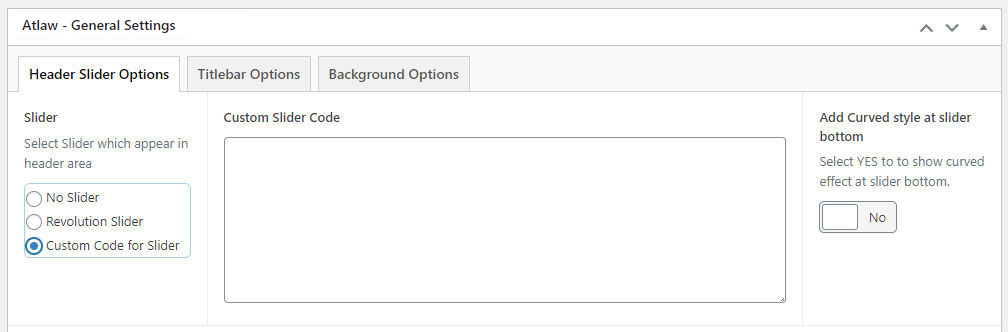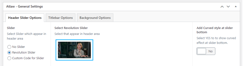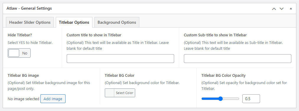 This will override the options set under Atlaw Options > Titlebar Settings options. This will help you to set special design the Titlebar on specific page or post.