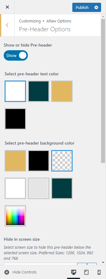 Pre-header section will appear above header area. You can show or hide it globally from Atlaw Options >> Pre-header Settings section.