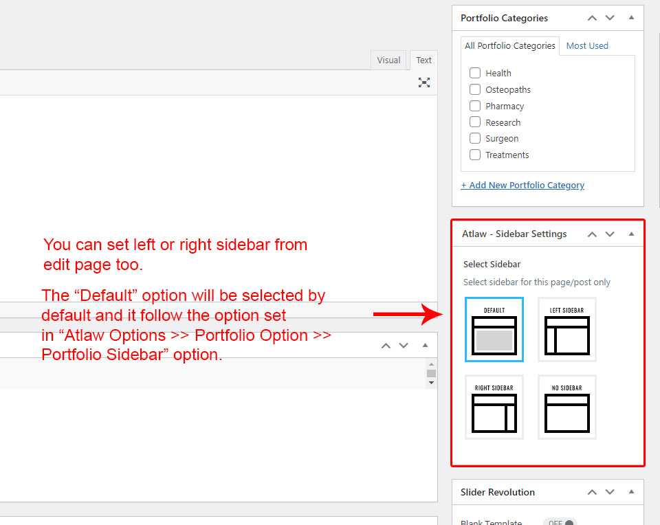 This is specially created sidebar postion for Portfolio Category view only. You can select sidebar view (left or right) in Atlaw Options >> Portfolio Options section. Also you can show Portfolio Category without sidebar too.