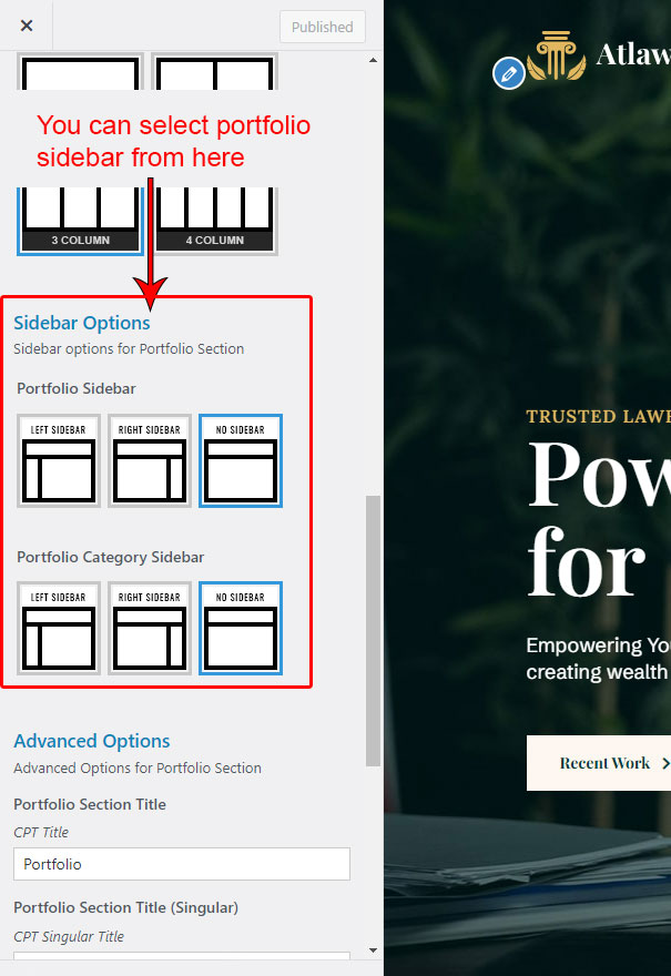 This is specially created sidebar postion for Portfolio single view only. You can select sidebar view (left or right) in Atlaw Options >> Portfolio Options section. Also you can show single Portfolio without sidebar too.