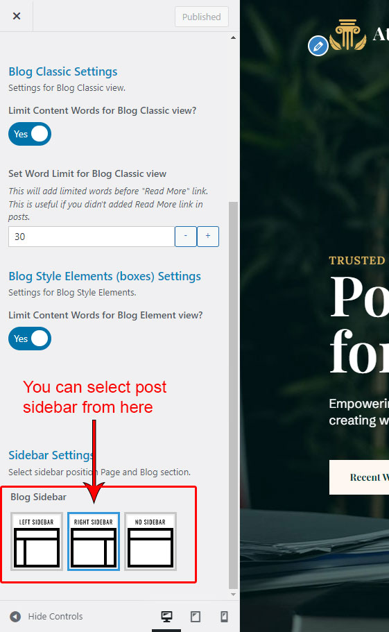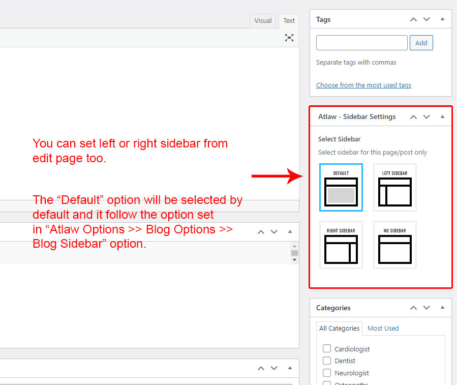 This is specially created sidebar postion (either left or right as selected in Atlaw Options section) that will be shown as sidebar widget on Blog pages like blog list view, single post view, blog category view etc.
