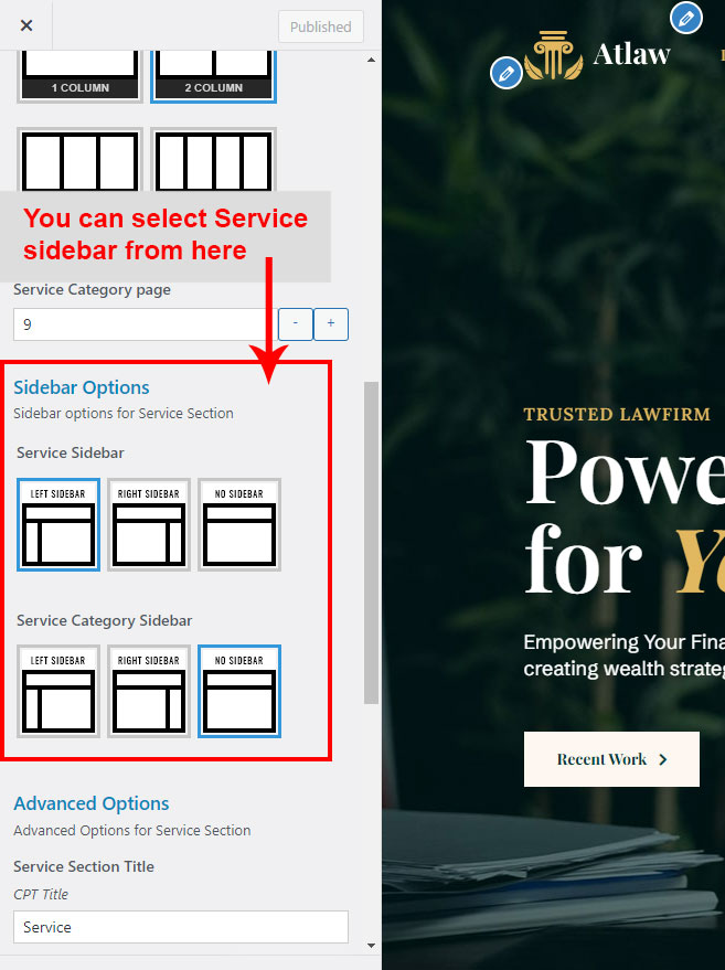This is specially created sidebar postion for Service Category view only. You can select sidebar view (left or right) in Atlaw Options >> Service Options section. Also you can show Service Category without sidebar too.