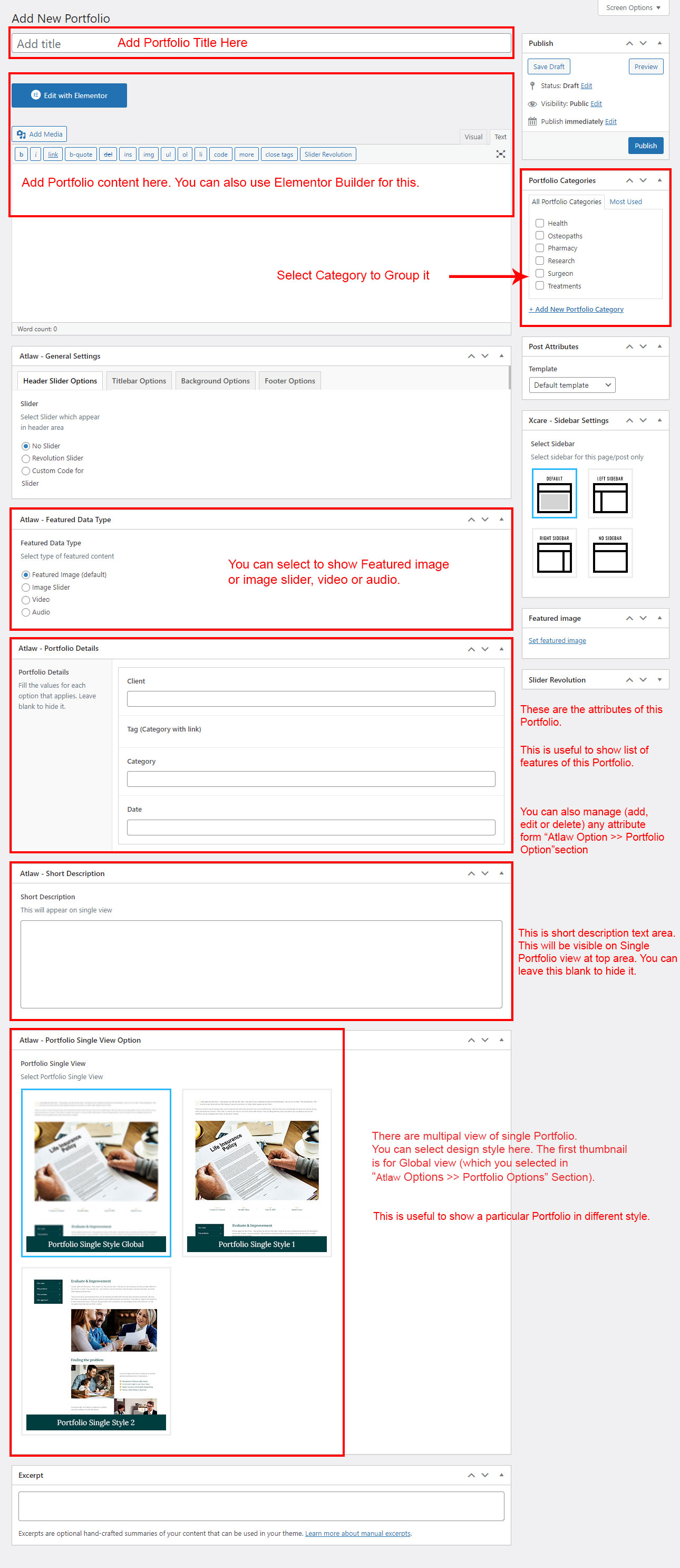 If you already done demo content setup than you can edit existing portfolio and check how we added data so you can understand each option perfectly.