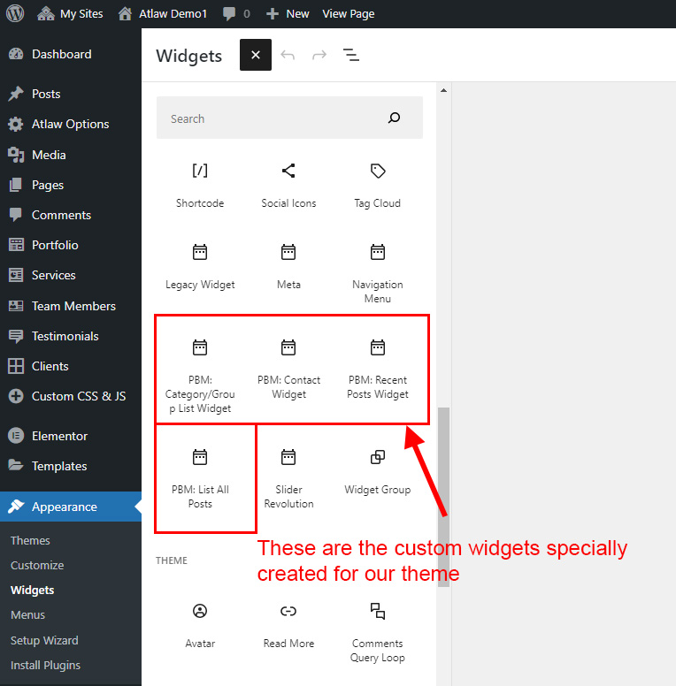 There are some widgets created specially for Atlaw theme. Here are the widgets: