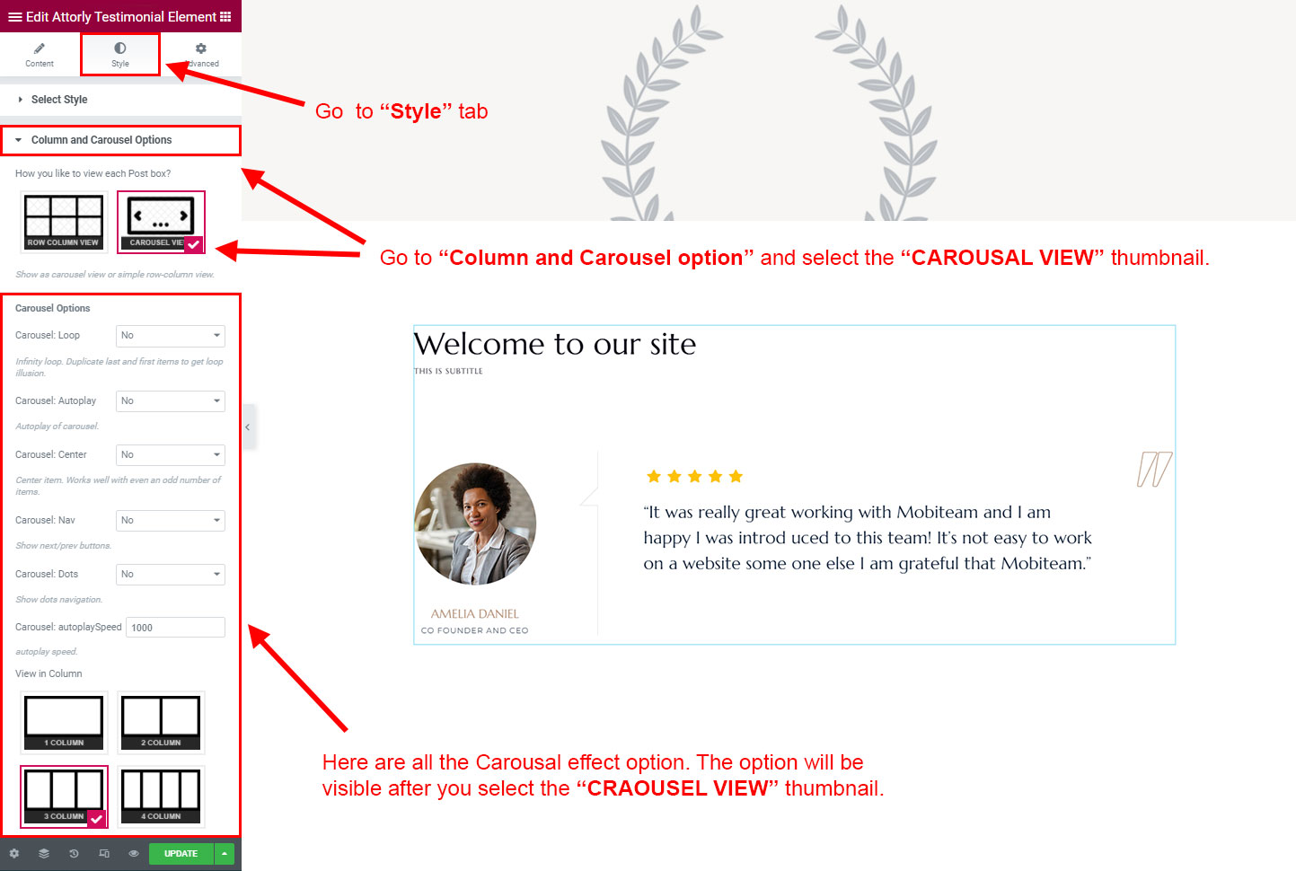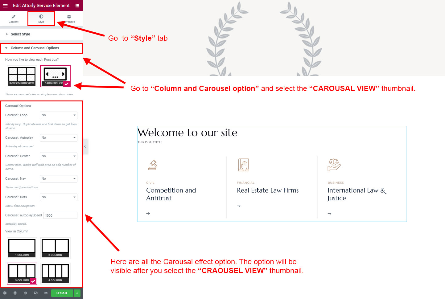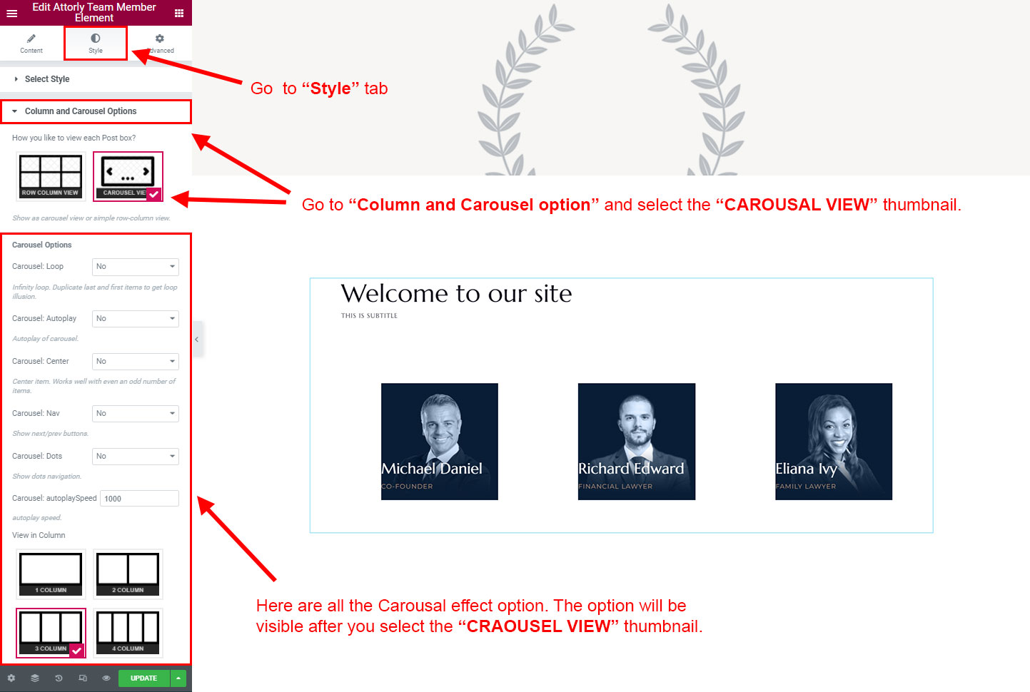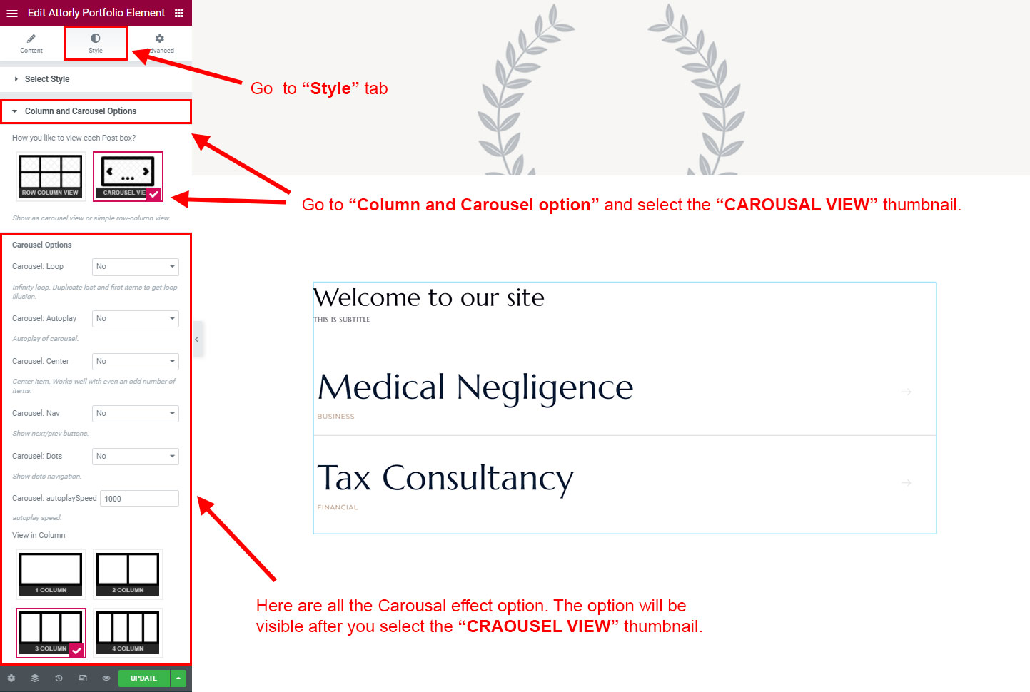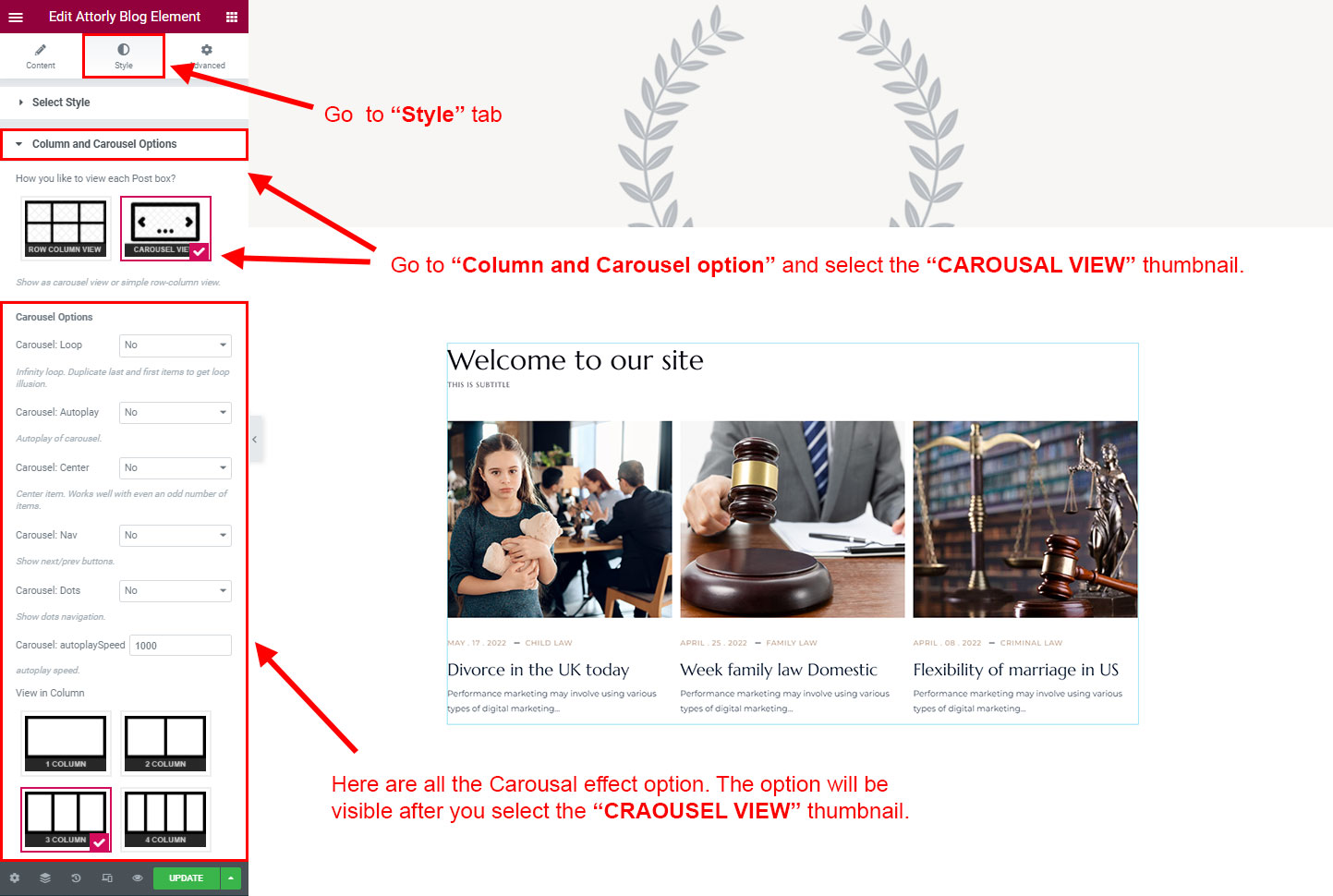 CAROSUEL VIEW: The Carousel view will be animated sliding view. There are lot's of options for the slideing animatins. Like animation speed, animation column, auto-play on or off, Loop post boxes, show/hide the dot or arrow navigation etc.