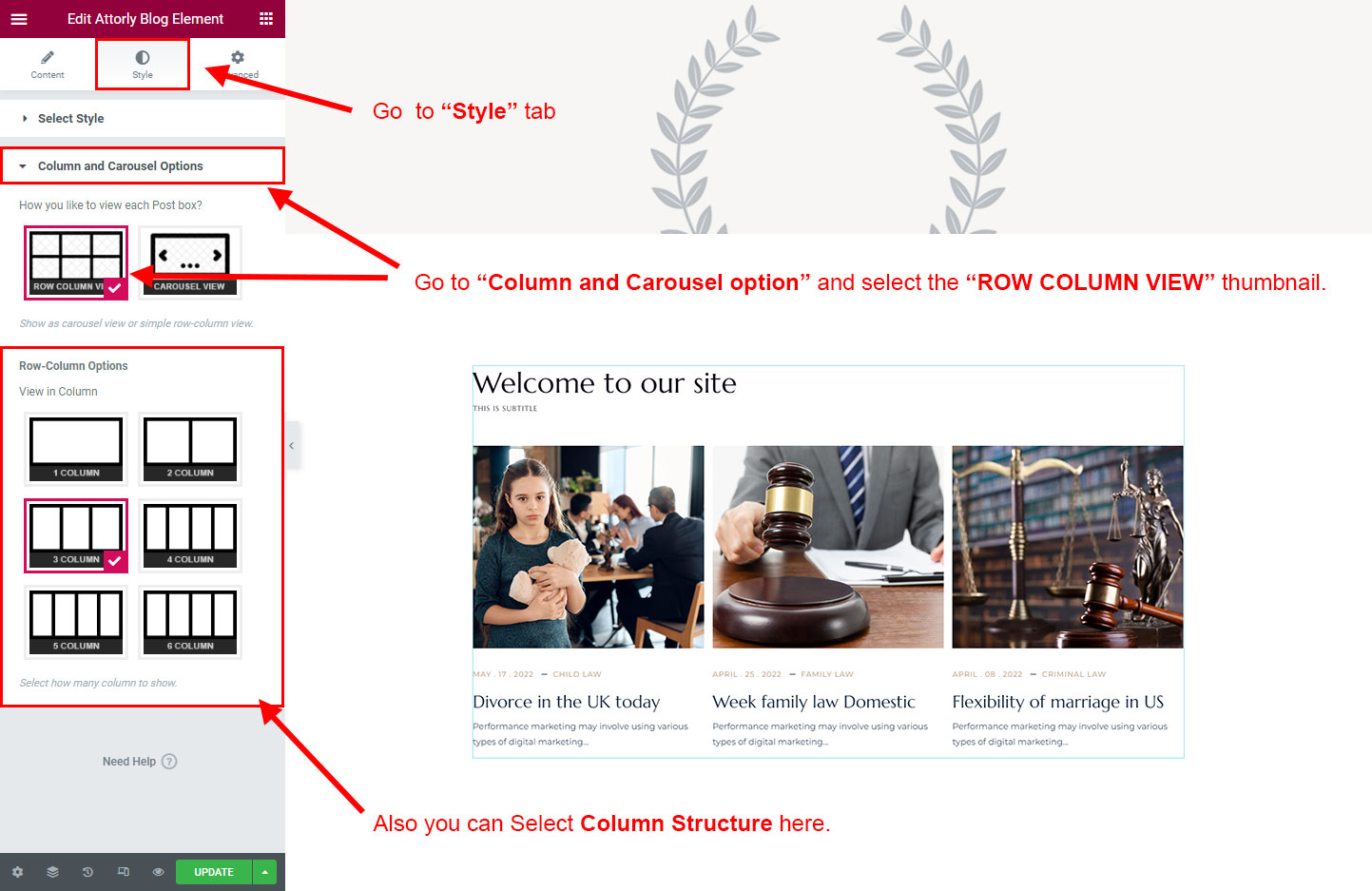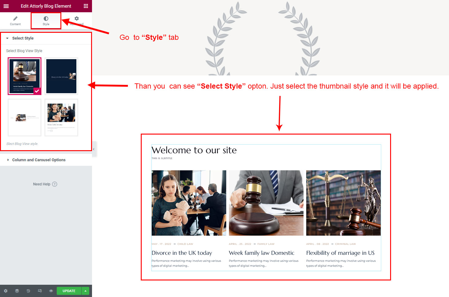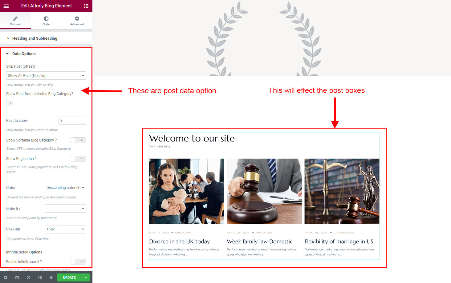 We created a Blog Element in Elementor Page Builder which you can use to show post on any page you want. Just drag and drop the Attorly Blog Element on any page and the post list will appear.