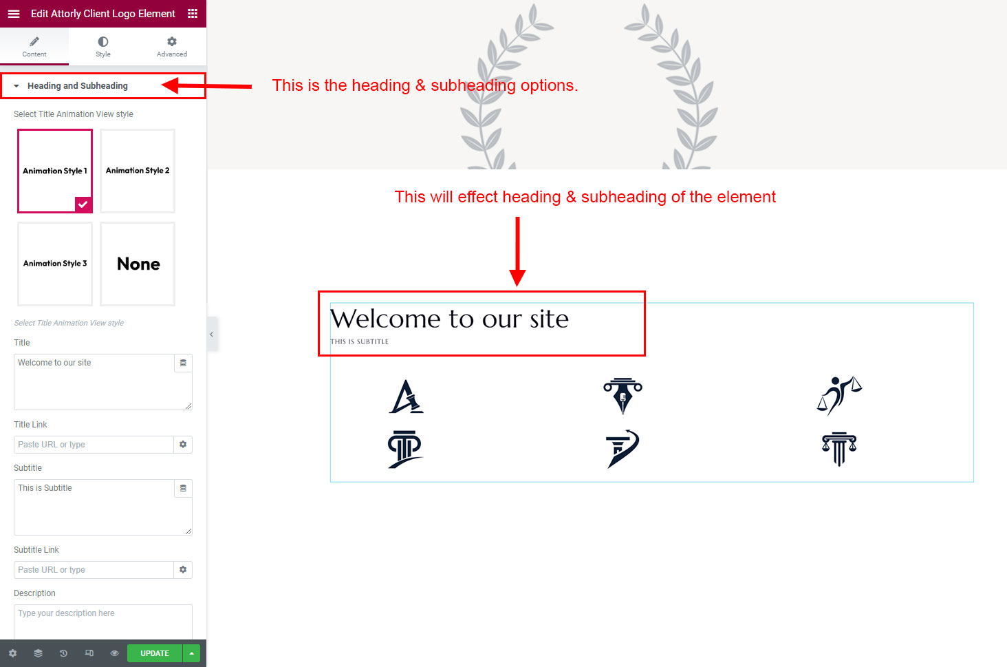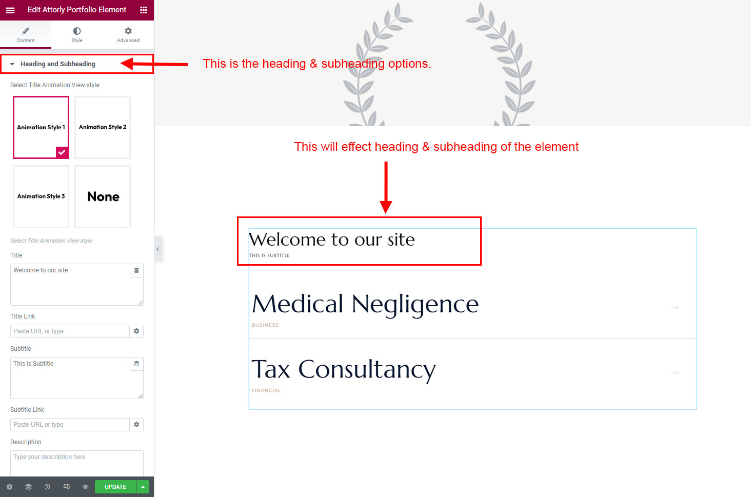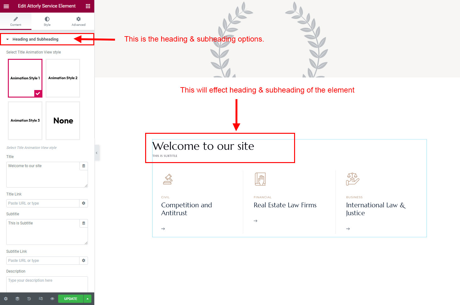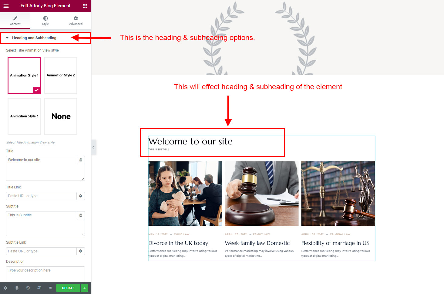 The heading and subheading will appear at top of the element. You can change text, add link to the heading or subheading, change alignment, change tag (for SEO purpose) etc.