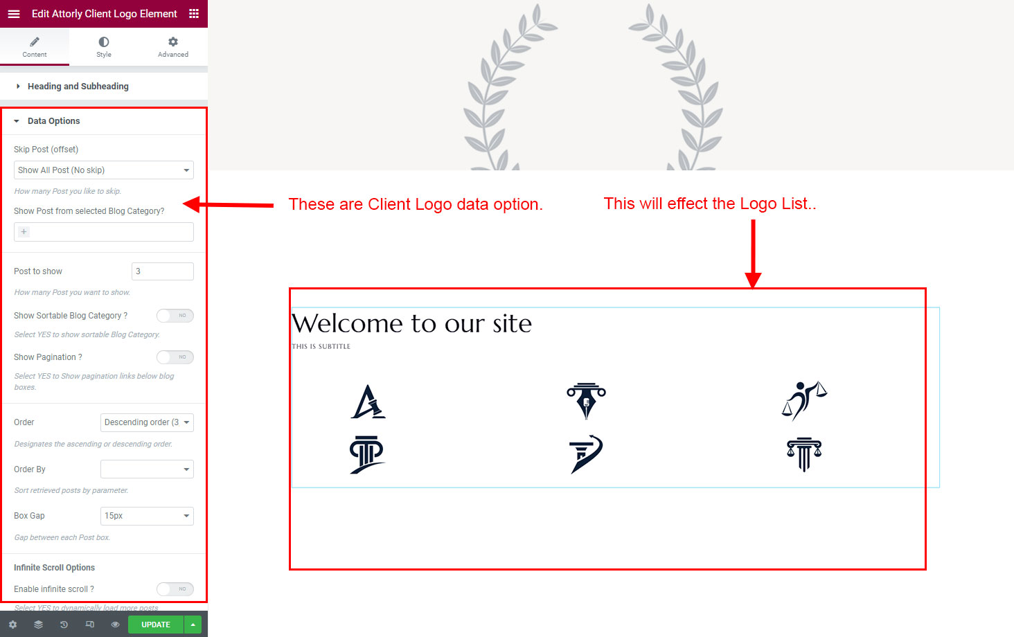 You can select the client-logo options here. Like how many client-logo you like to show, show client-logo from selected group (category), client-logo order etc.