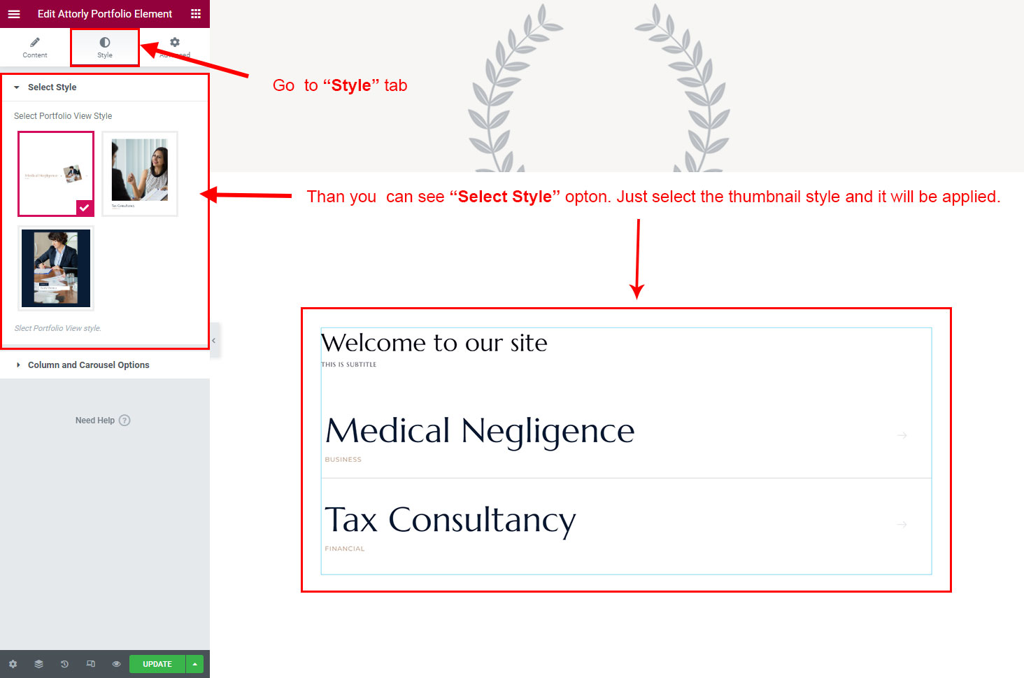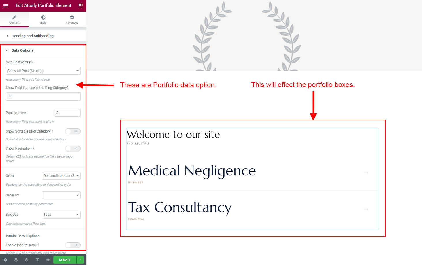 You can select the portfolio options here. Like how many portfolio you like to show, show portfolio from selected category, portfolio order etc.