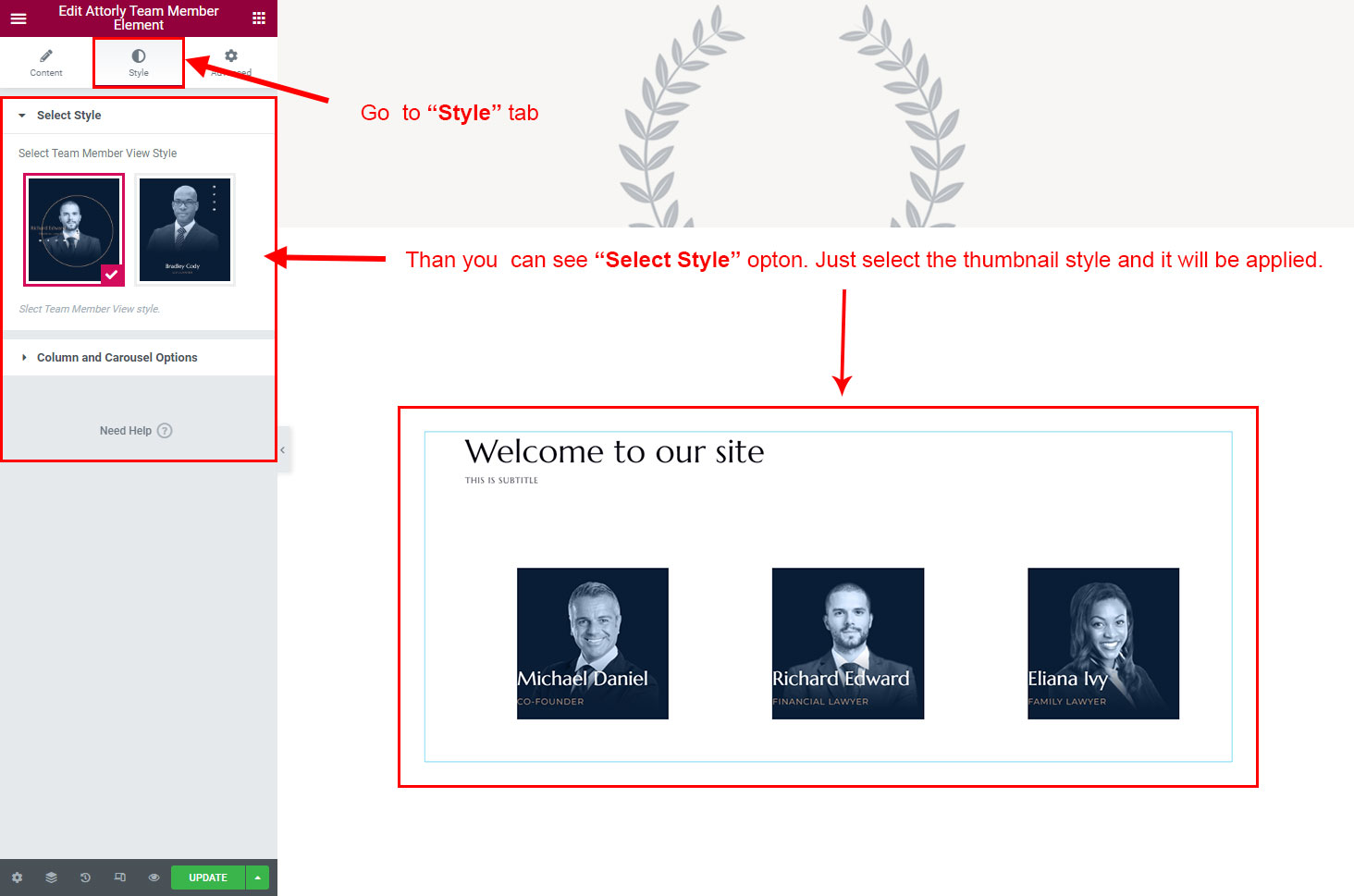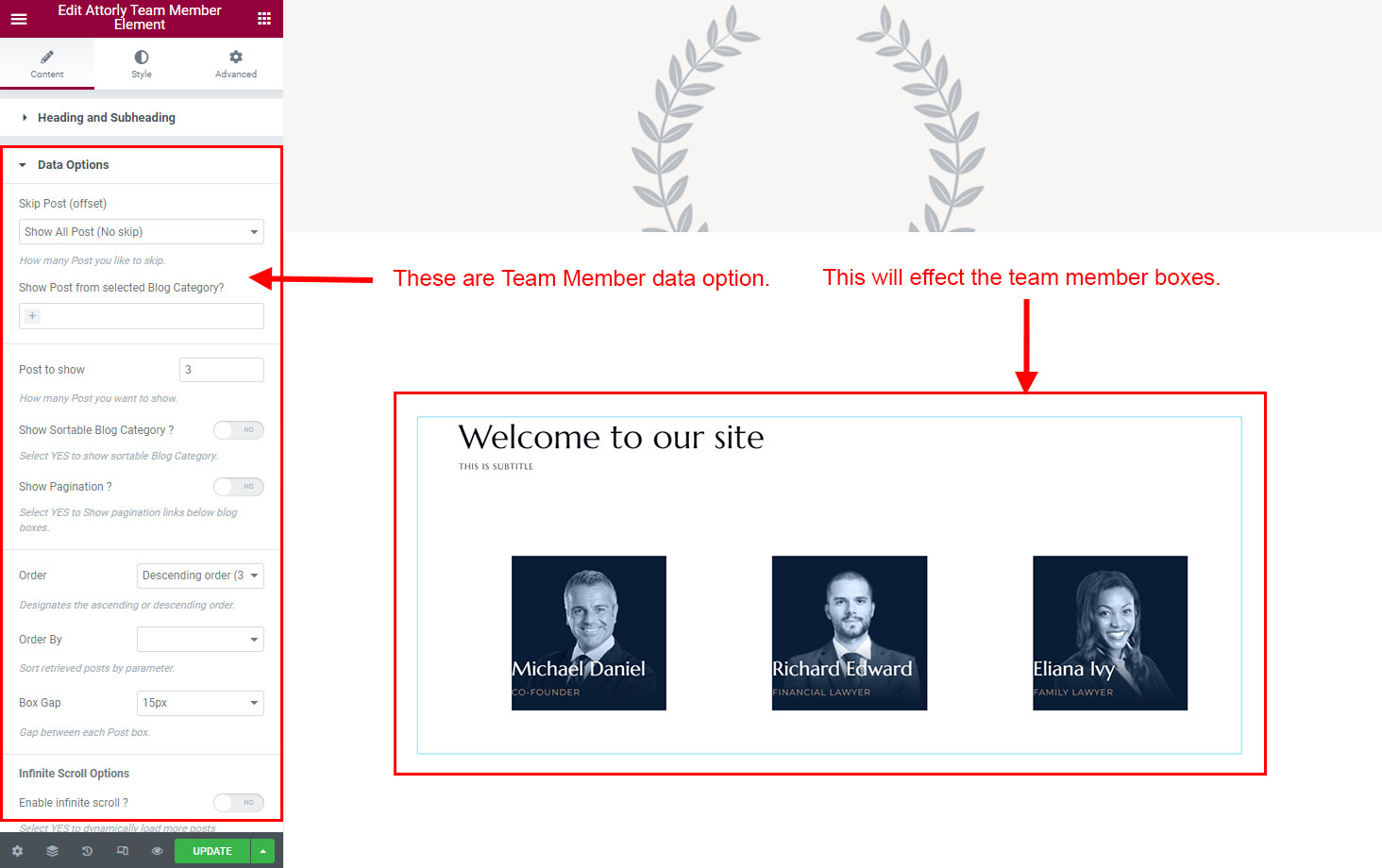You can select the team options here. Like how many team you like to show, show team from selected category, team order etc.