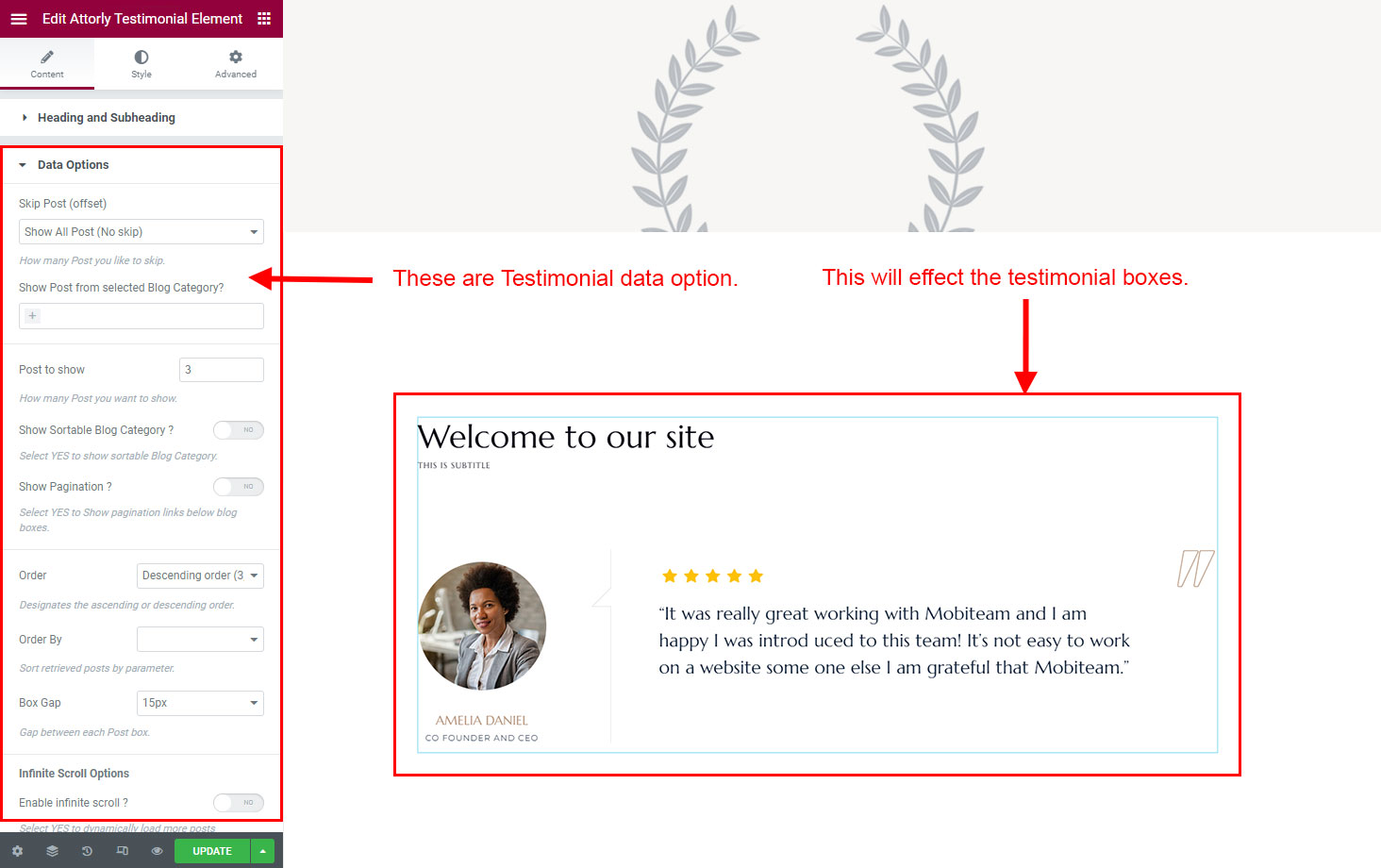 You can select the testimonial options here. Like how many testimonial you like to show, show testimonial from selected group (category), testimonial order etc.