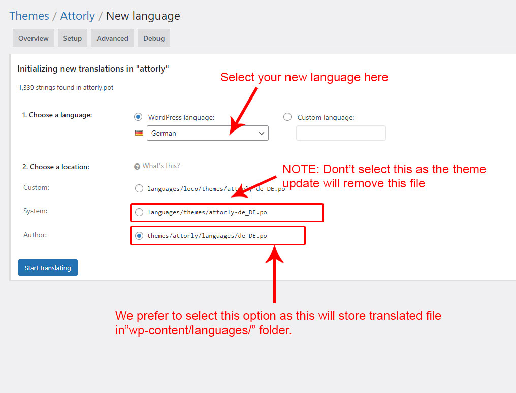 Within this section, you’ll find everything you need to localize and internationalize the Attorly theme into your language. It is split into several subsections to help you easily find what you need. There are different ways for this: