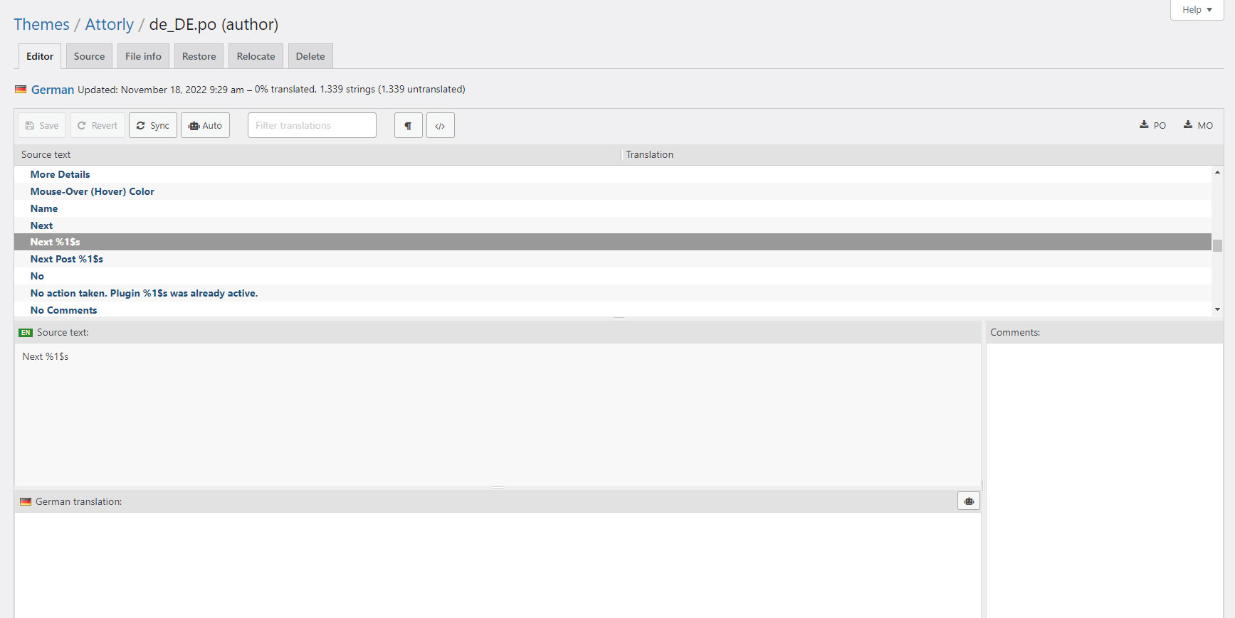 When you are done translating all the needed text strings into your desired language, save the file in /wp-content/languages/themes/ folder with language code in name. For example, if you were translating to the Deutsch language, you would save it as attorly-de_DE.po. The corresponding attorly-de_DE.mo file will be auto created by POEdit software.