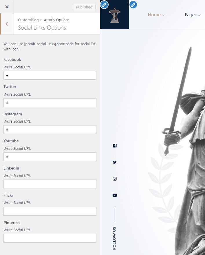 This shortcode specially created to show social links. You can set social links in Attorly Options >> Social Links Section and write your social links. Than it can be shown using [pbmit-social-links] shortcode.