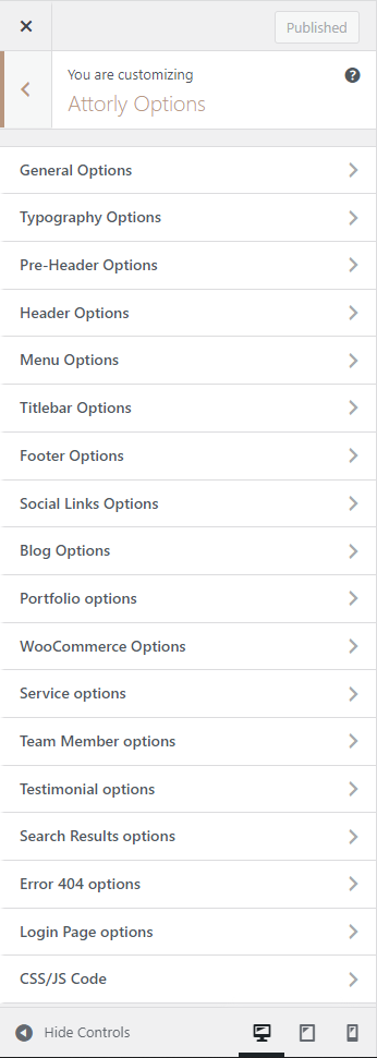 Attorly Options (Theme Options) panel is created with WordPress' Customize section. We added our own options with WordPress' default options.