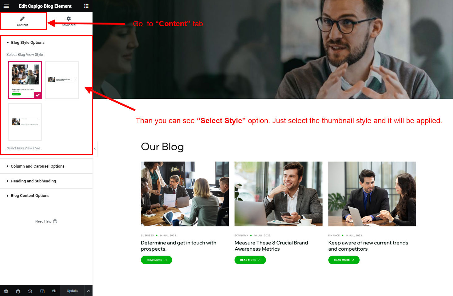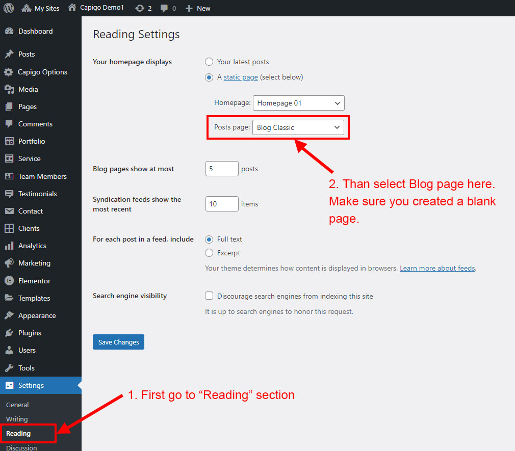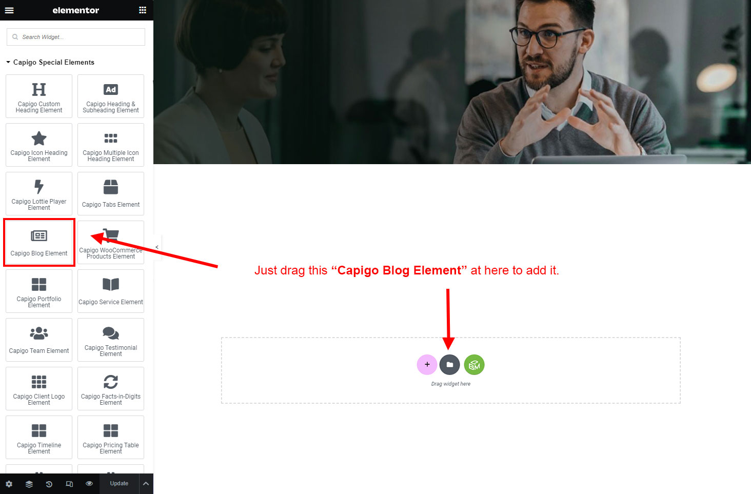 We created a Blog Element in Elementor Page Builder which you can use to show post on any page you want. Just drag and drop the Capigo Blog Element on any page and the post list will appear.