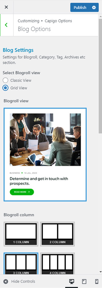 But you can change the view easily. Just go to Capigo Options >> Blog Options and you will find all options to modify the view. You can convert it to block view, column view, limit the blog intro text etc.