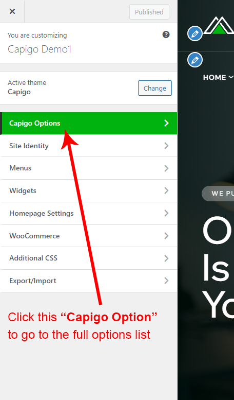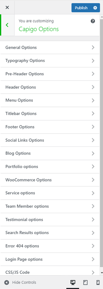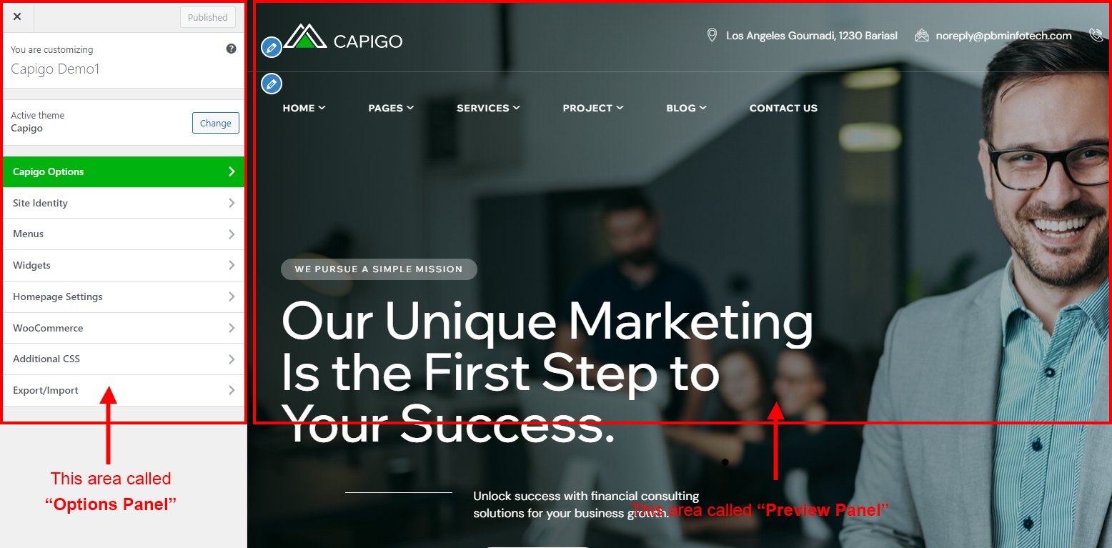 After clicking on the Capigo Options panel you will redirected to the Customize section. It has two sections. Left area called "Options Panel" and the right area called "Preview panel". See screenshot given below: