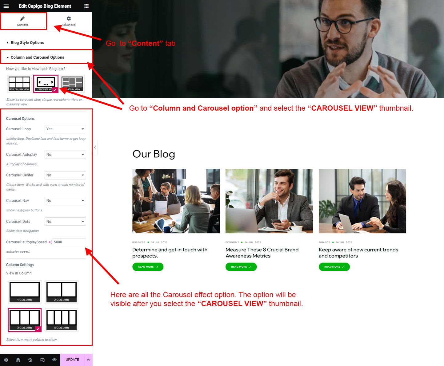 CAROSUEL VIEW: The Carousel view will be animated sliding view. There are lot's of options for the slideing animatins. Like animation speed, animation column, auto-play on or off, Loop post boxes, show/hide the dot or arrow navigation etc.