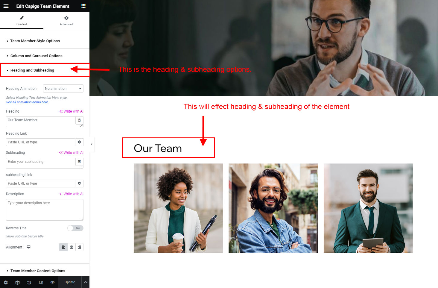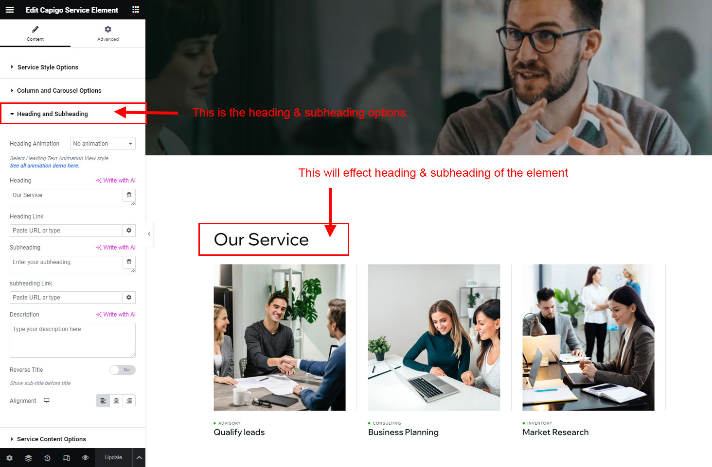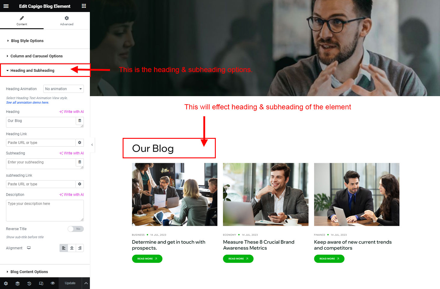 The heading and subheading will appear at top of the element. You can change text, add link to the heading or subheading, change alignment, change tag (for SEO purpose) etc.