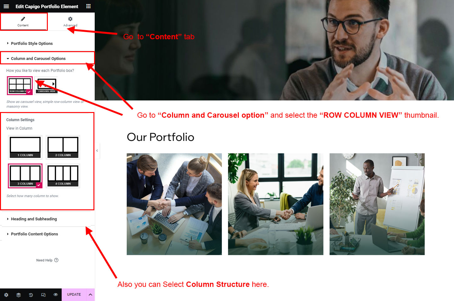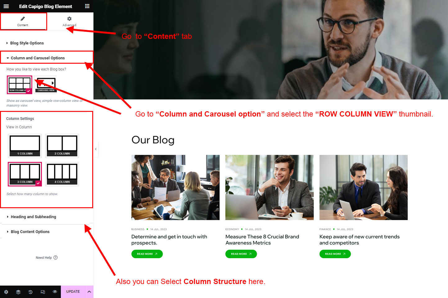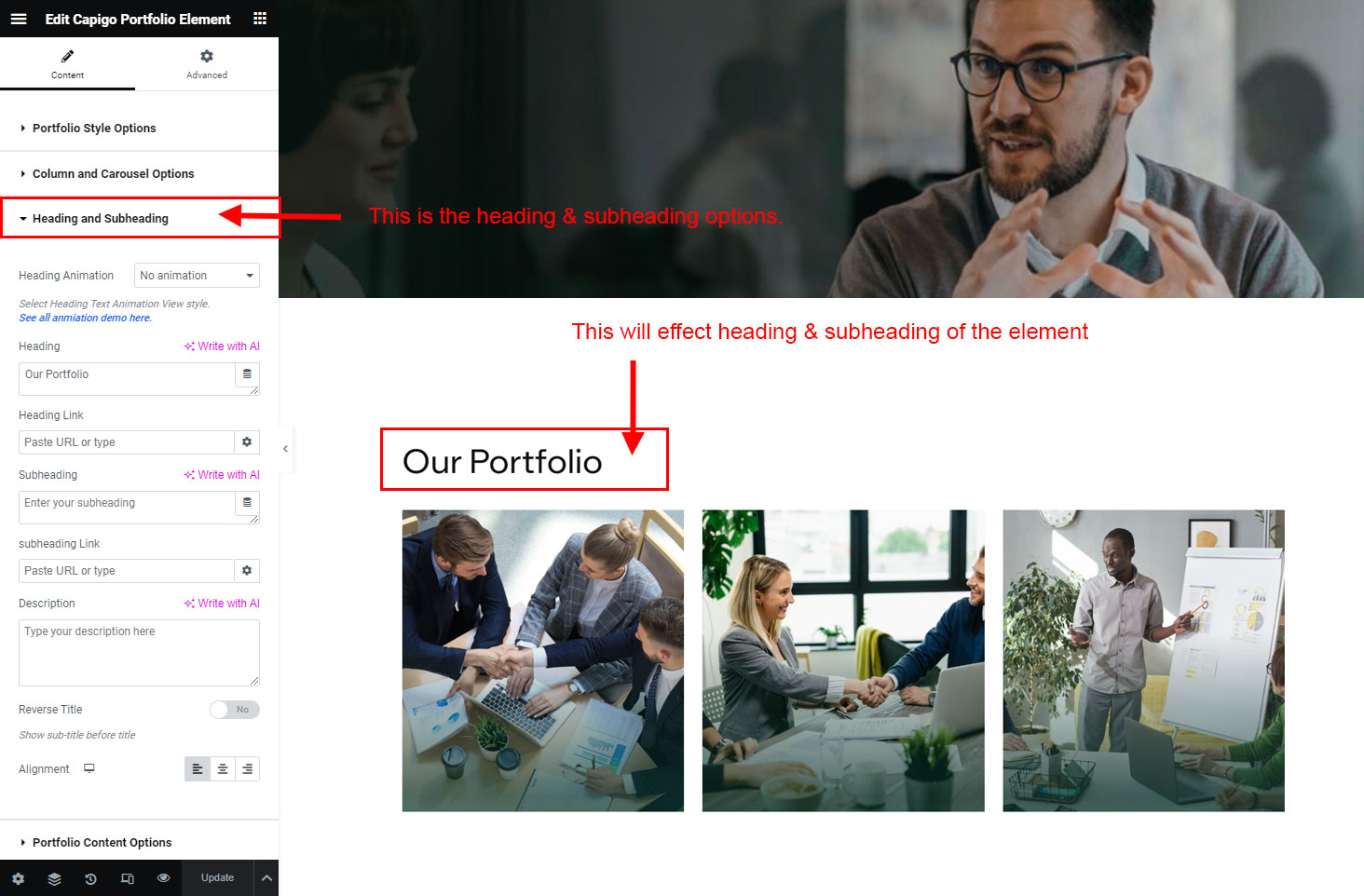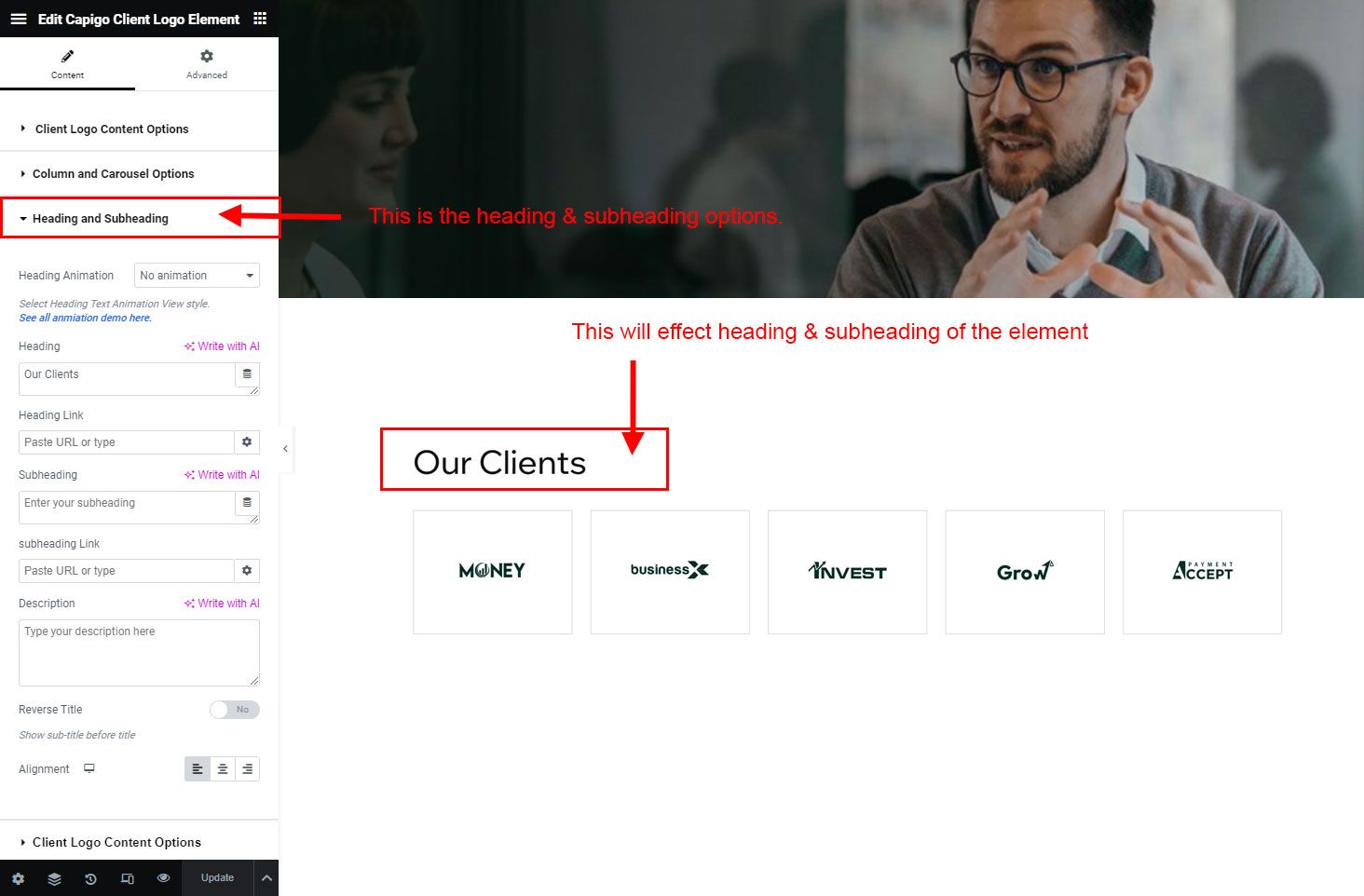 The heading and subheading will appear at top of the element. You can change text, add link to the heading or subheading, change alignment, change tag (for SEO purpose) etc.