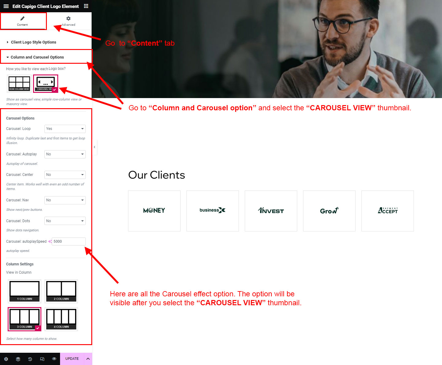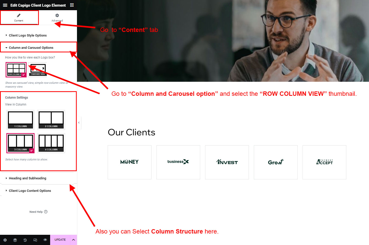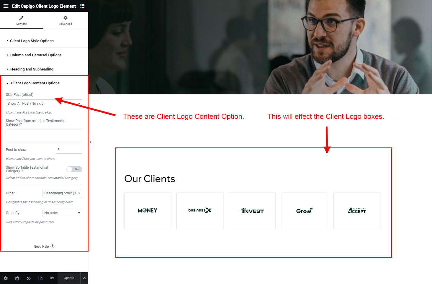 You can select the client-logo options here. Like how many client-logo you like to show, show client-logo from selected group (category), client-logo order etc.
