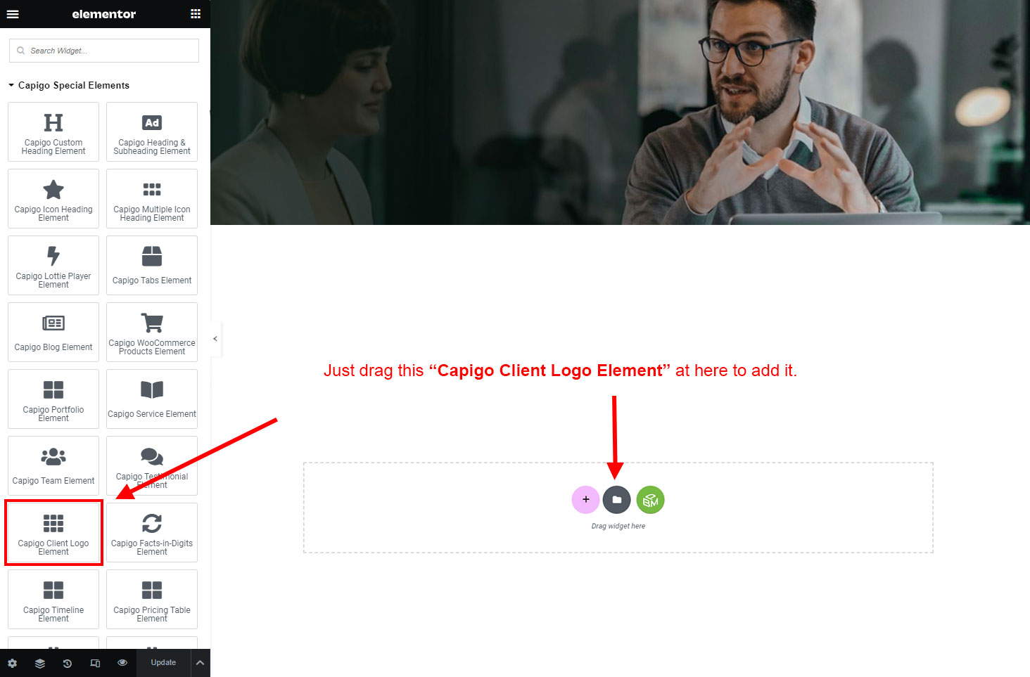 Now we have some Client Logo posts. So we can show all Client Logo on a page. Create a new page and add Capigo Client Logo Element on a page by dragging it.