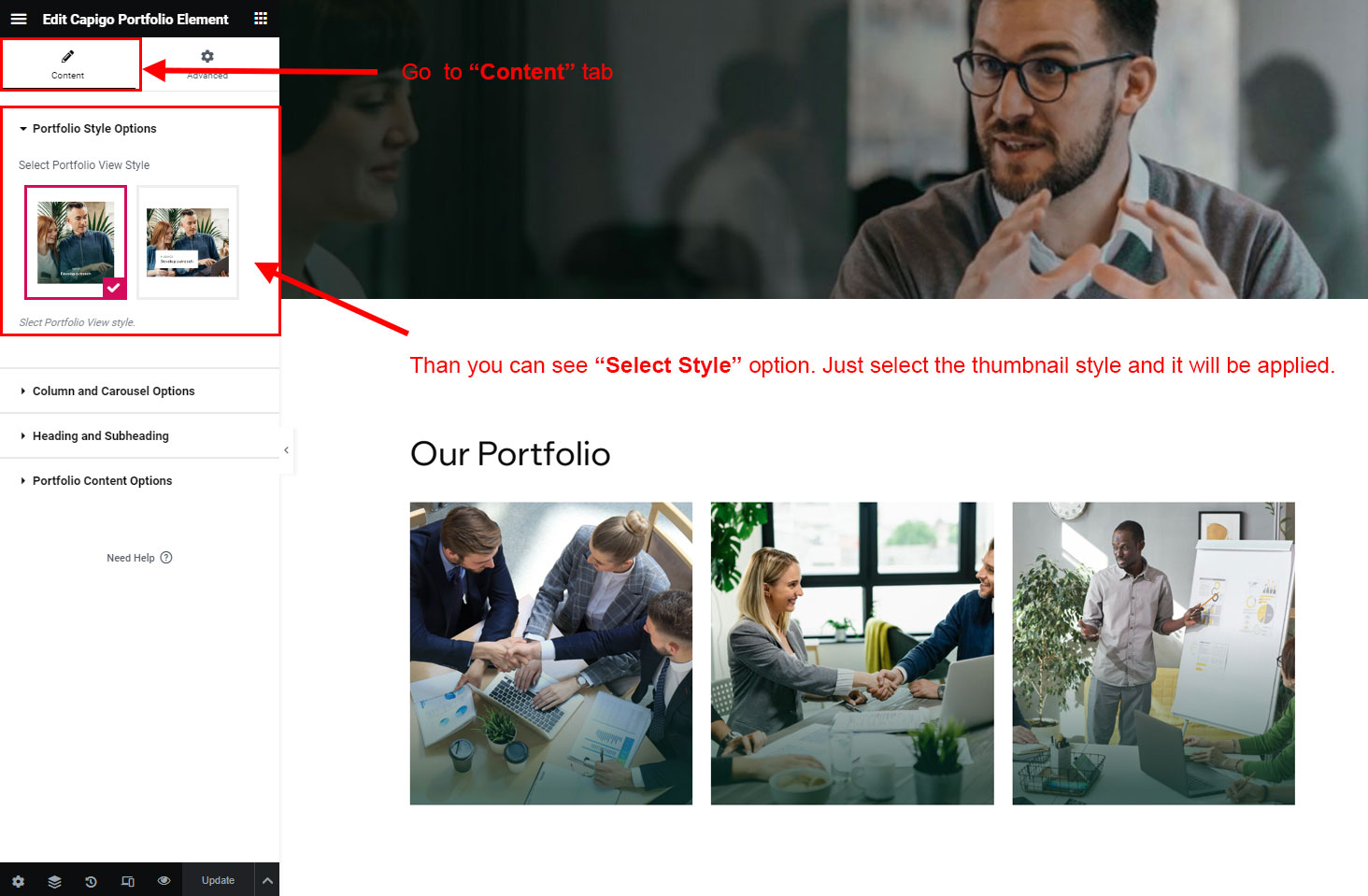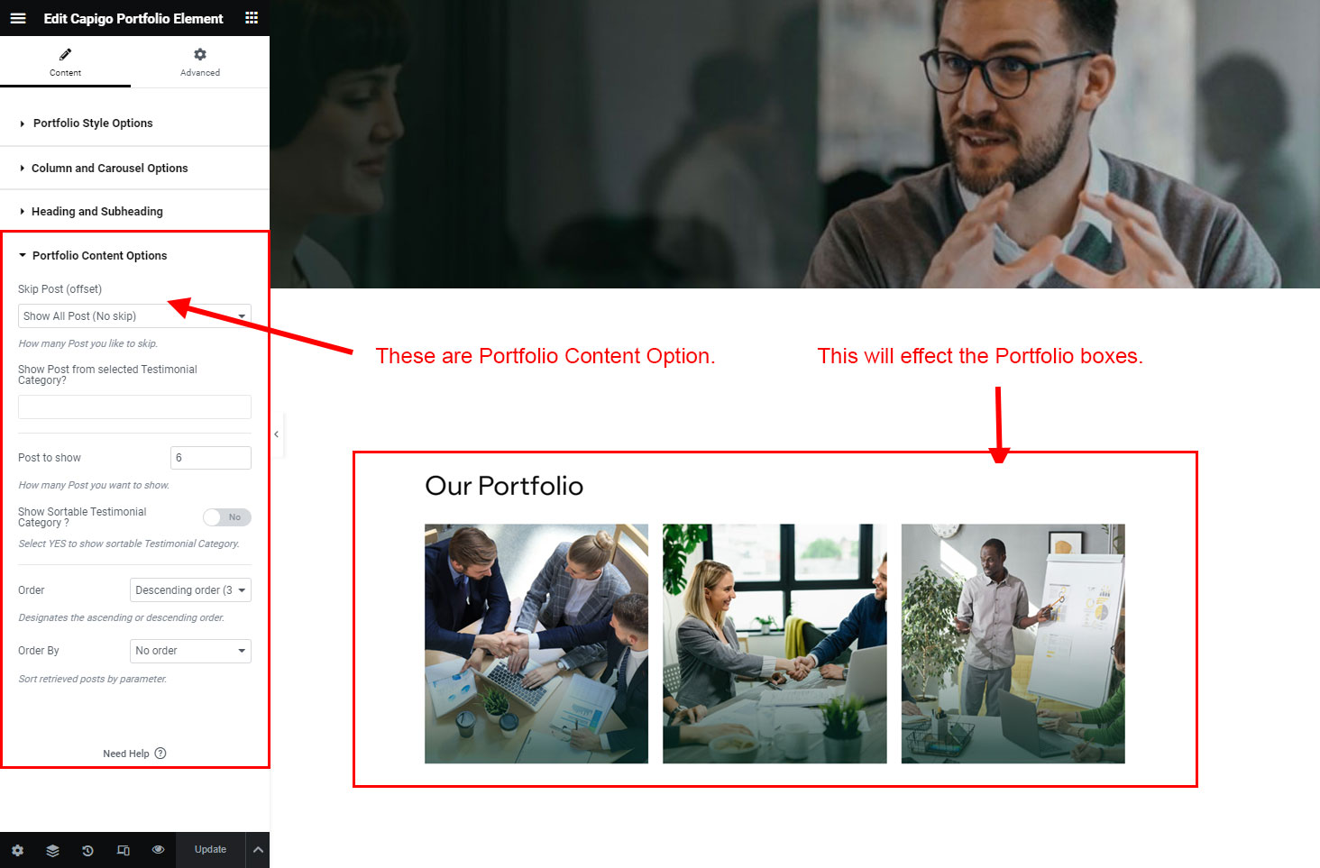 You can select the portfolio options here. Like how many portfolio you like to show, show portfolio from selected category, portfolio order etc.