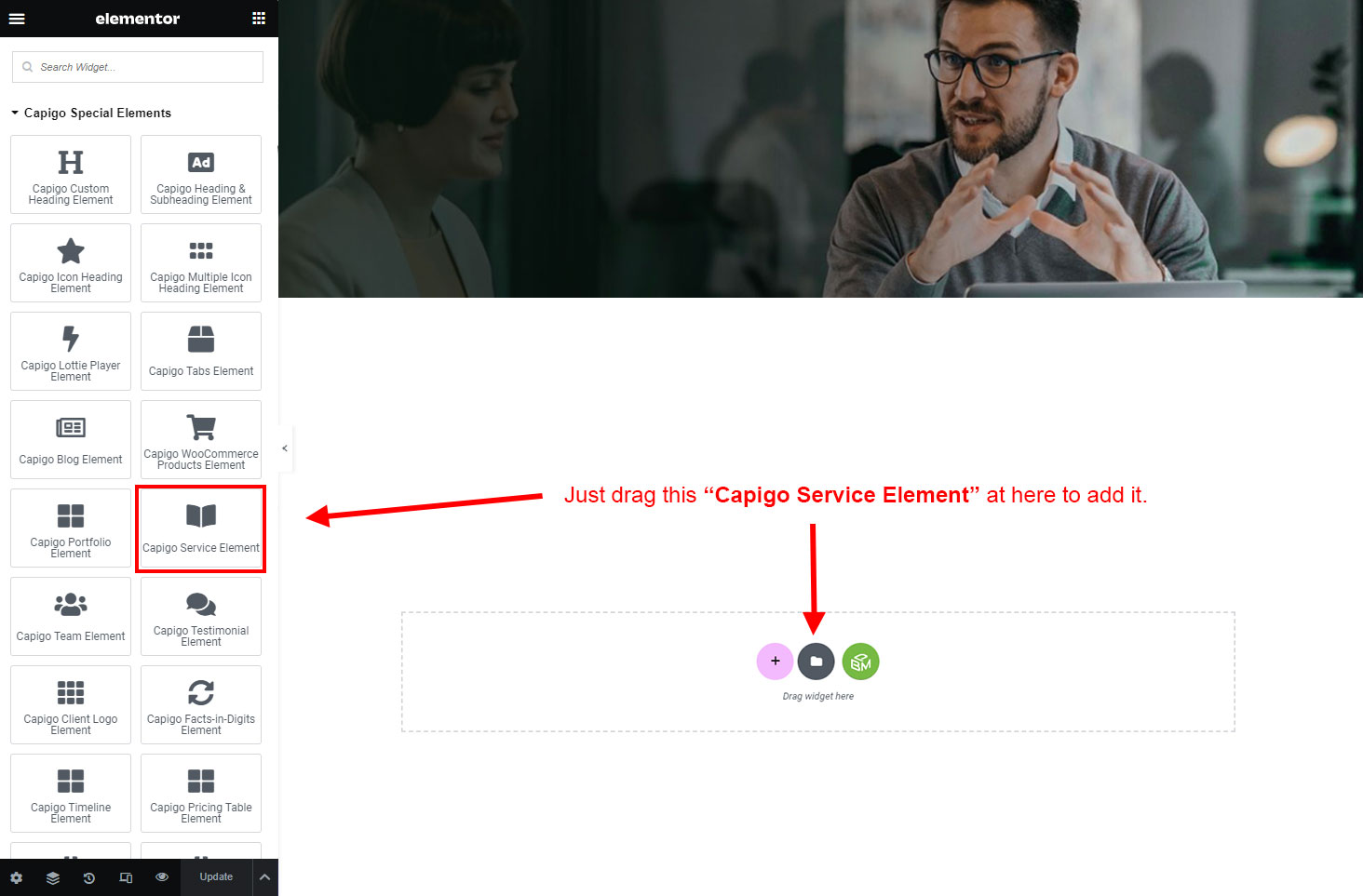 Now we have some Service posts. So we can show all Service on a page. Create a new page and add Capigo Service Element on a page by dragging it.