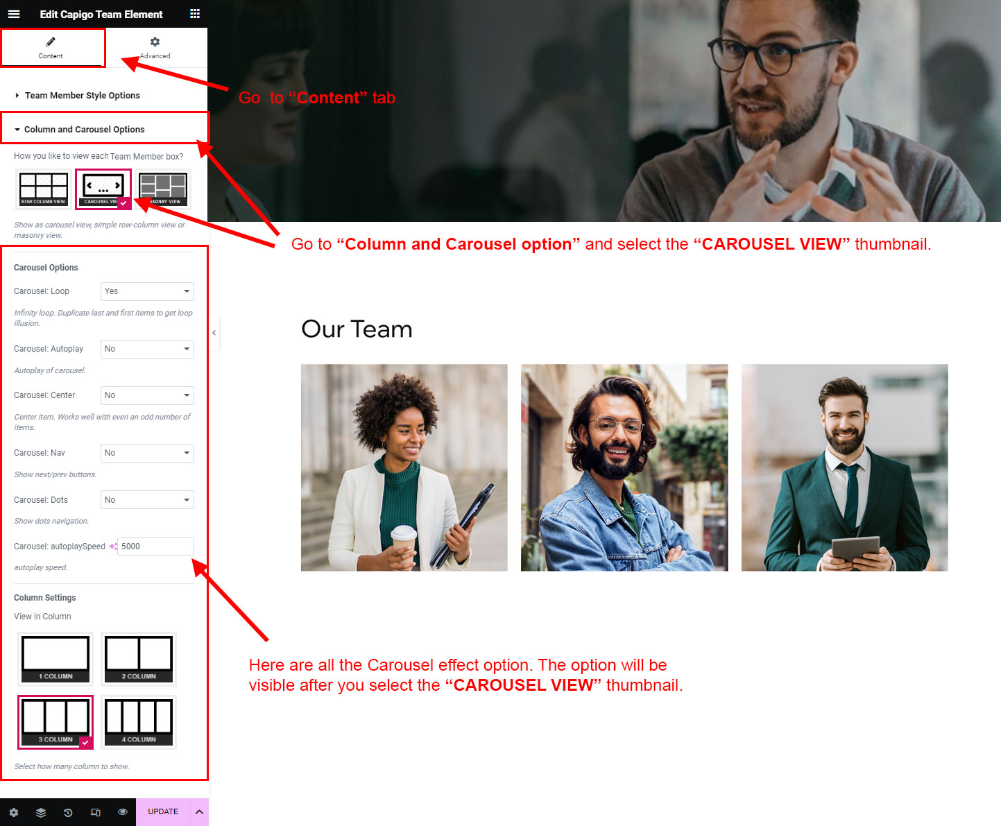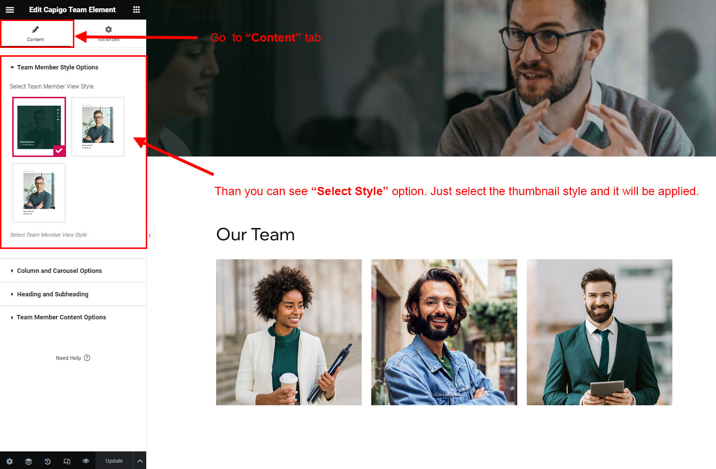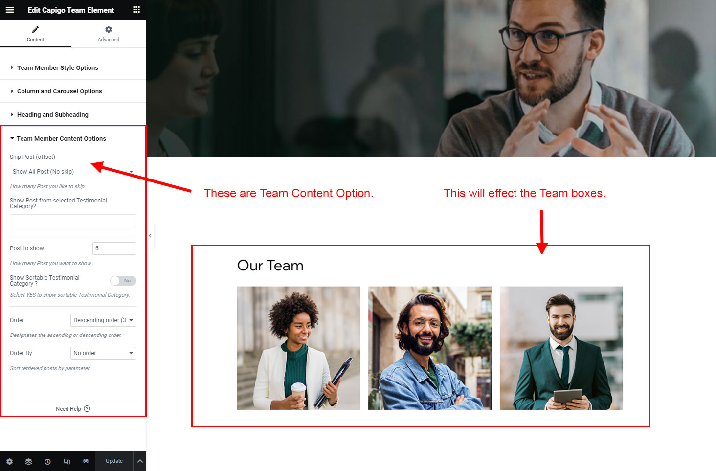 You can select the team options here. Like how many team you like to show, show team from selected category, team order etc.