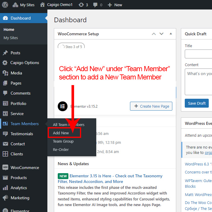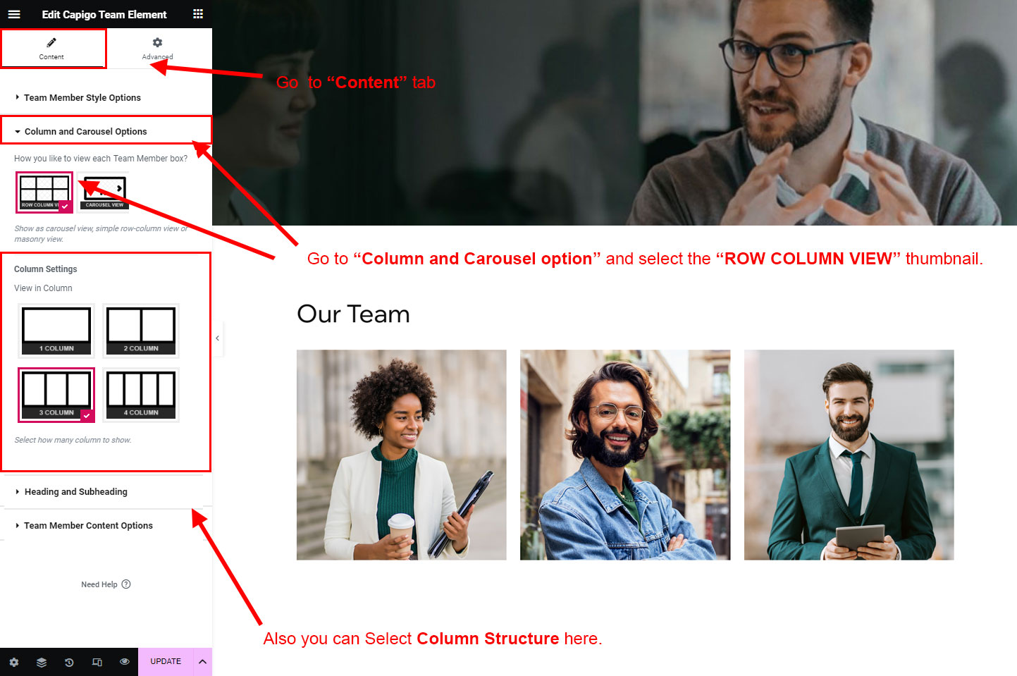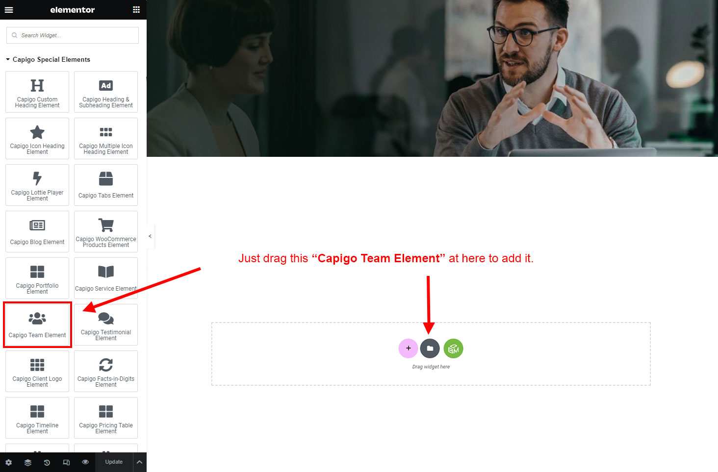 Now we have some Team posts. So we can show all Team on a page. Create a new page and add Capigo Team Member Element on a page by dragging it.