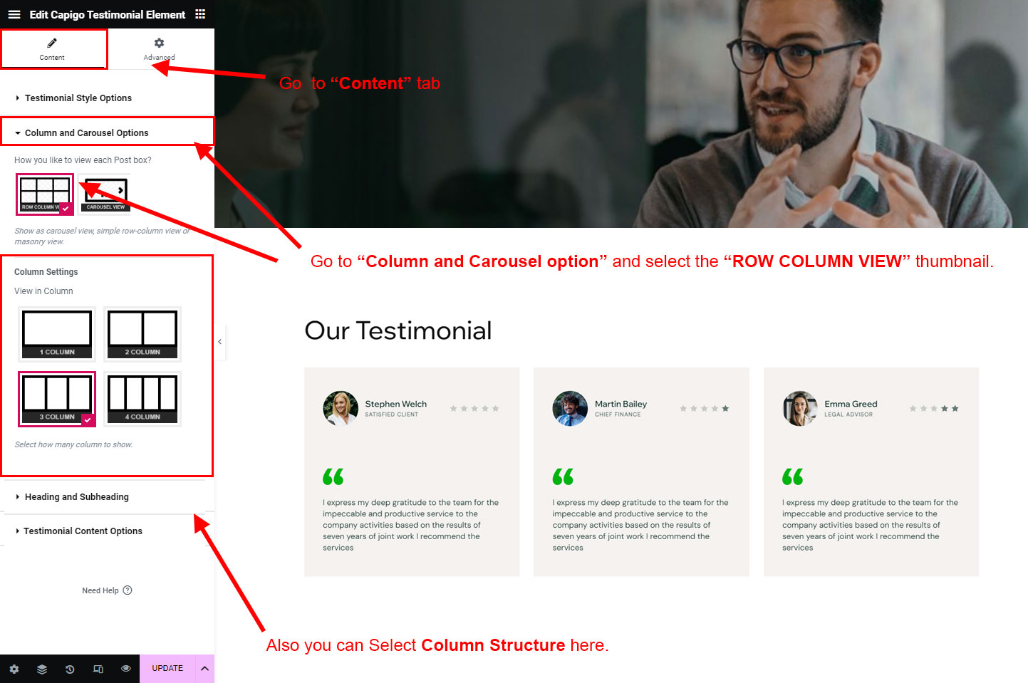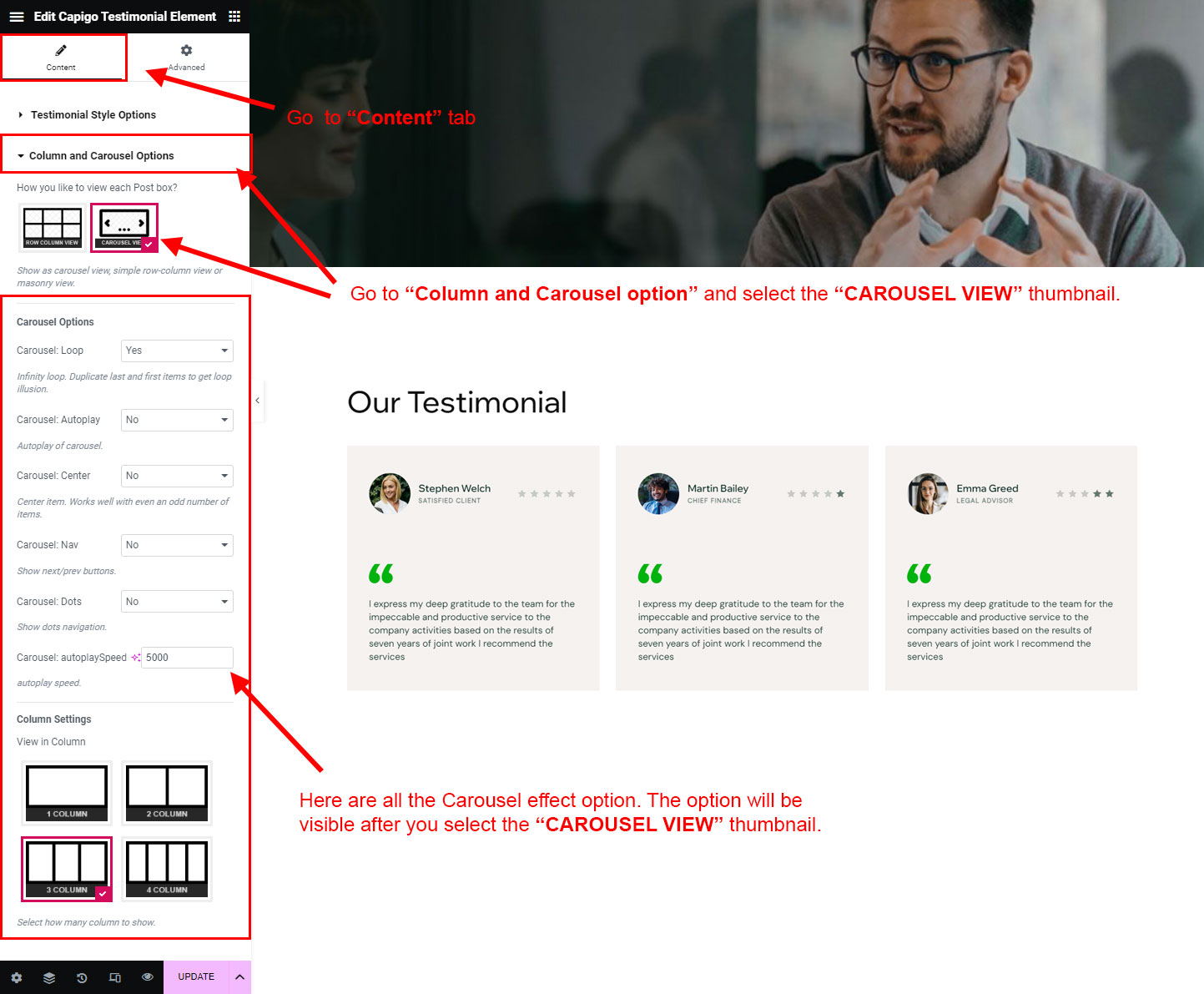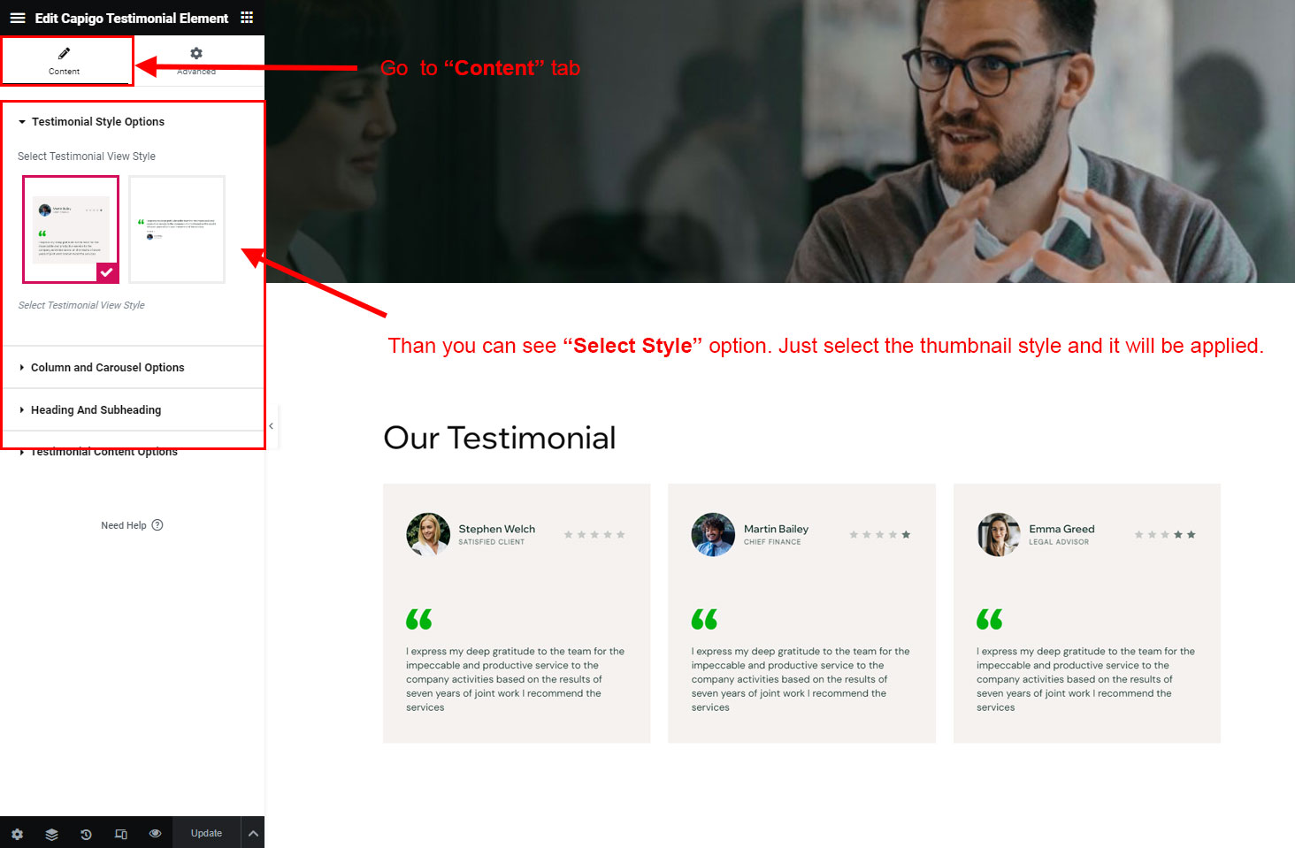 You can select the testimonial options here. Like how many testimonial you like to show, show testimonial from selected group (category), testimonial order etc.