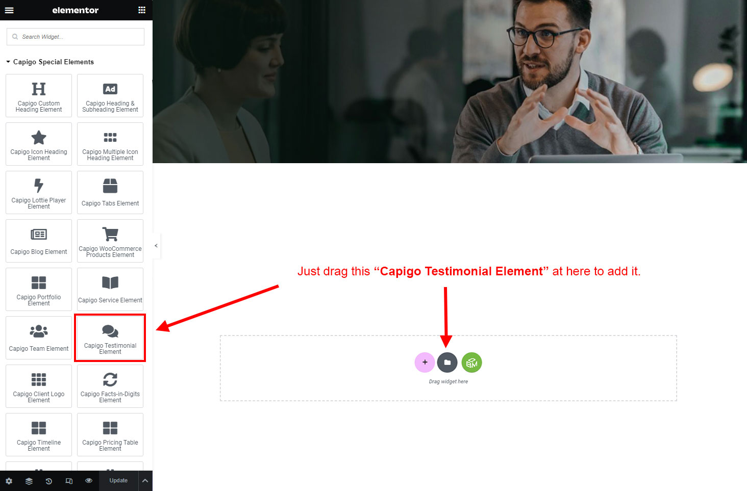 Now we have some Testimonial posts. So we can show all Testimonial on a page. Create a new page and add Capigo Testimonial Element on a page by dragging it.