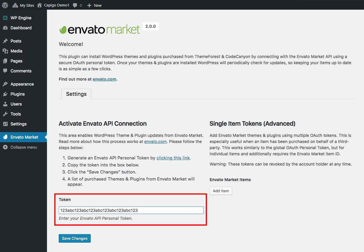 Now go back to your WordPress installation and paste in your Envato API token then click save.