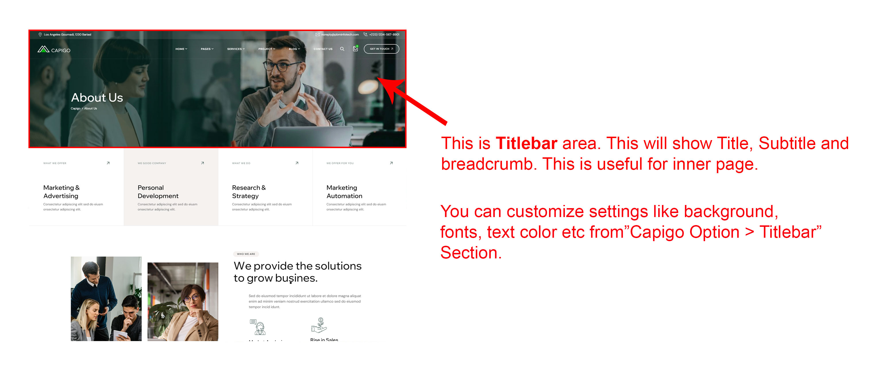 Generally the Titlebar will appear on inner page. This will appear below header area. This will show page title, subtitle and breadcrumb. (Where is Titlebar?)