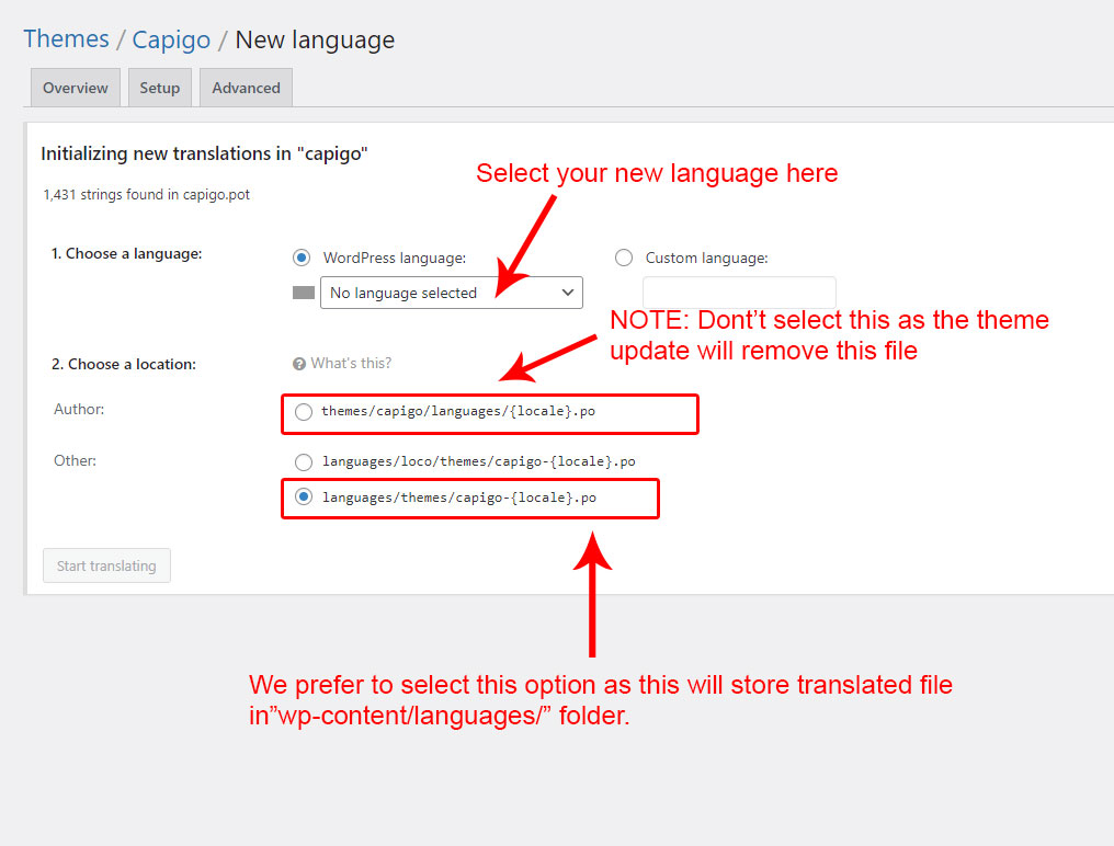 5. Now select the new language. Also make sure you select the last option (the languages/themes/file.po option) so it will store file in "wp-content" folder.