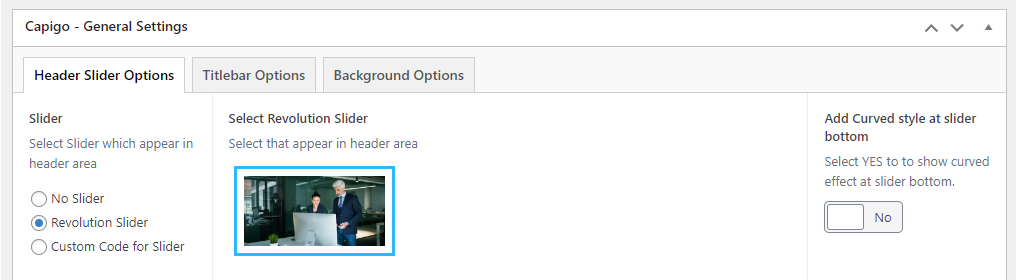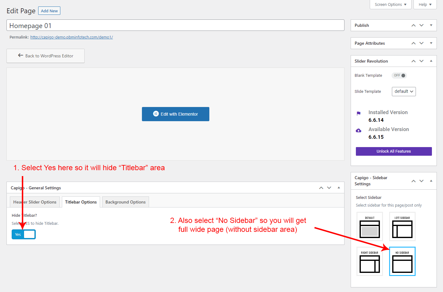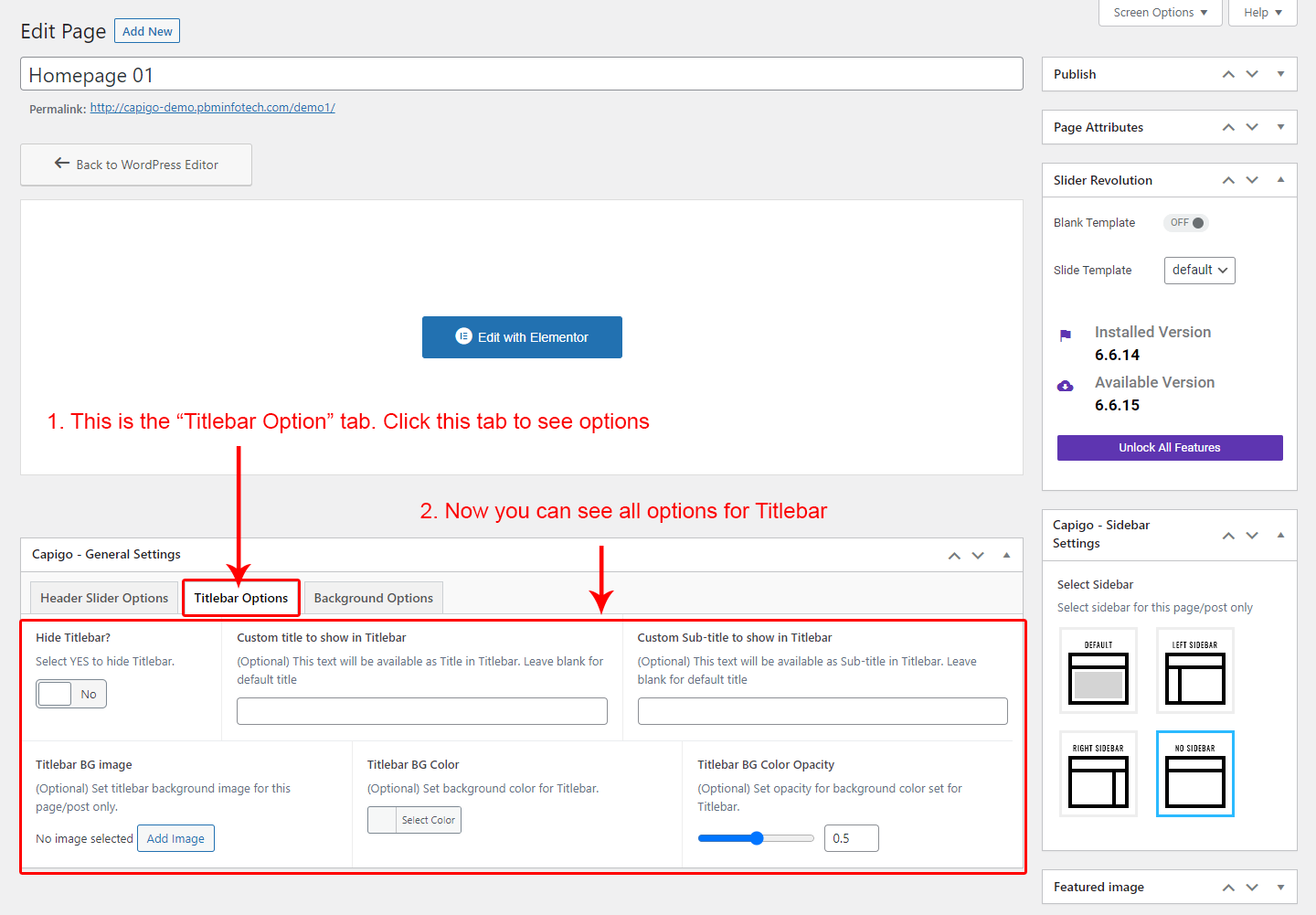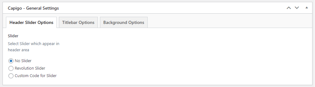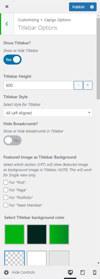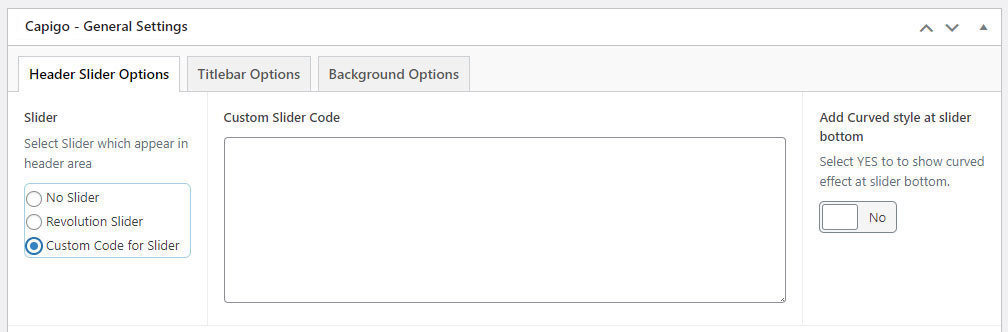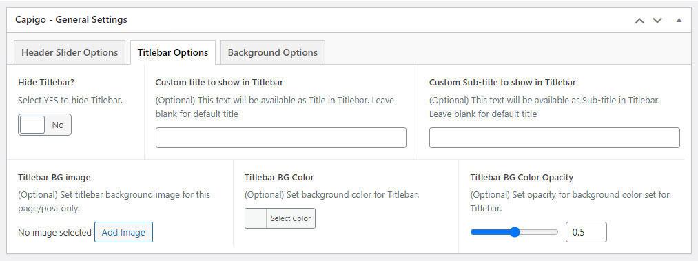This will override the options set under Capigo Options > Titlebar Settings options. This will help you to set special design the Titlebar on specific page or post.
