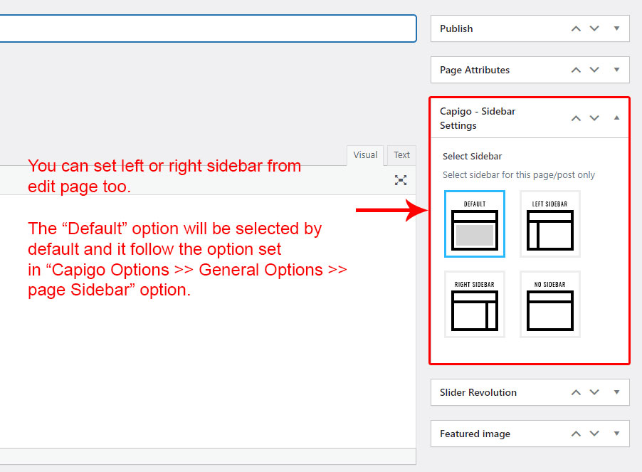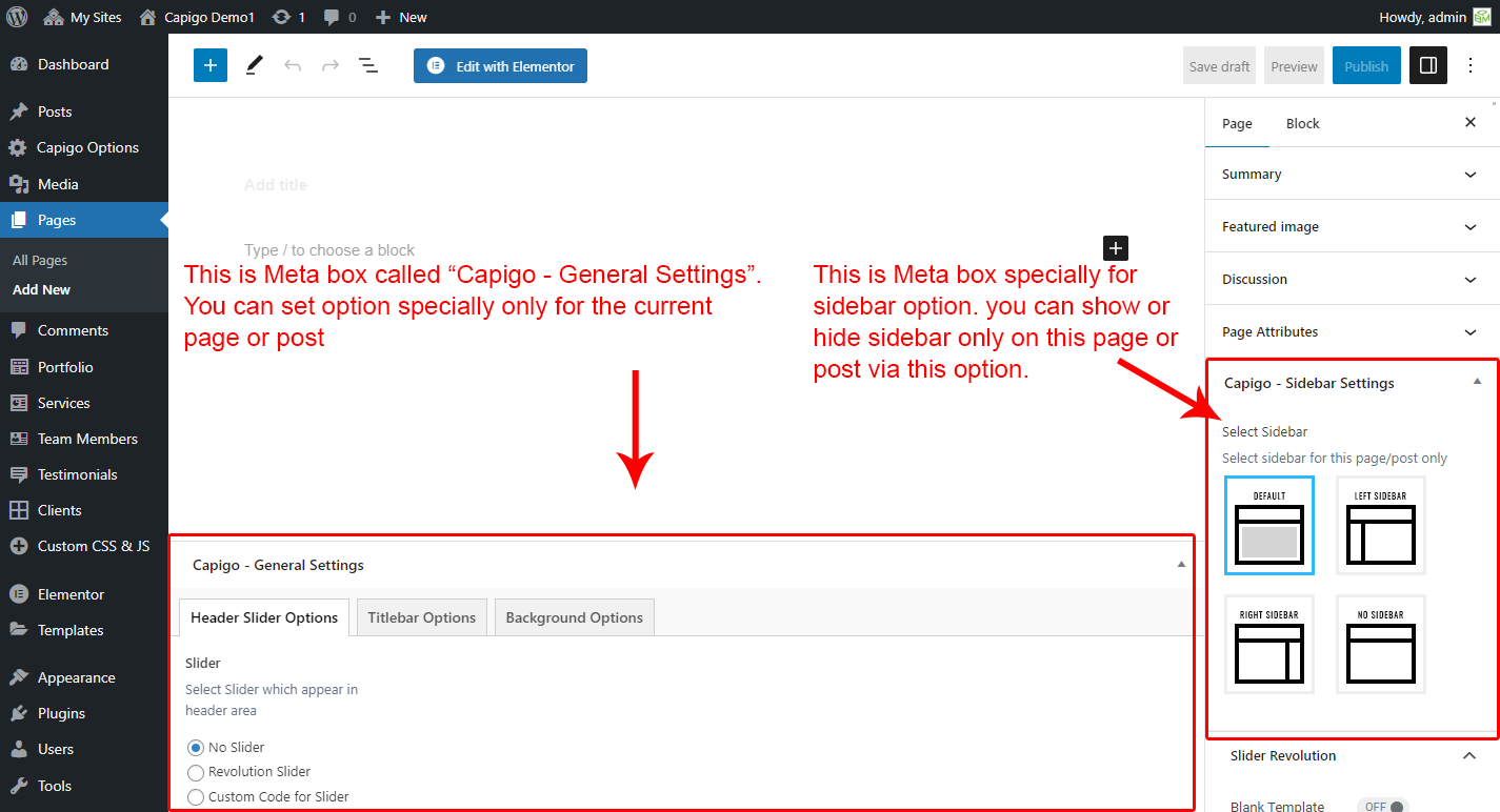 Meta box are special options that will apply to current page or post only. So you can set special view of a page or post. See above image for the Metabox example.