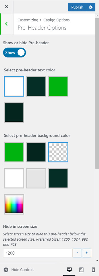 Pre-header section will appear above header area. You can show or hide it globally from Capigo Options >> Pre-header Settings section.
