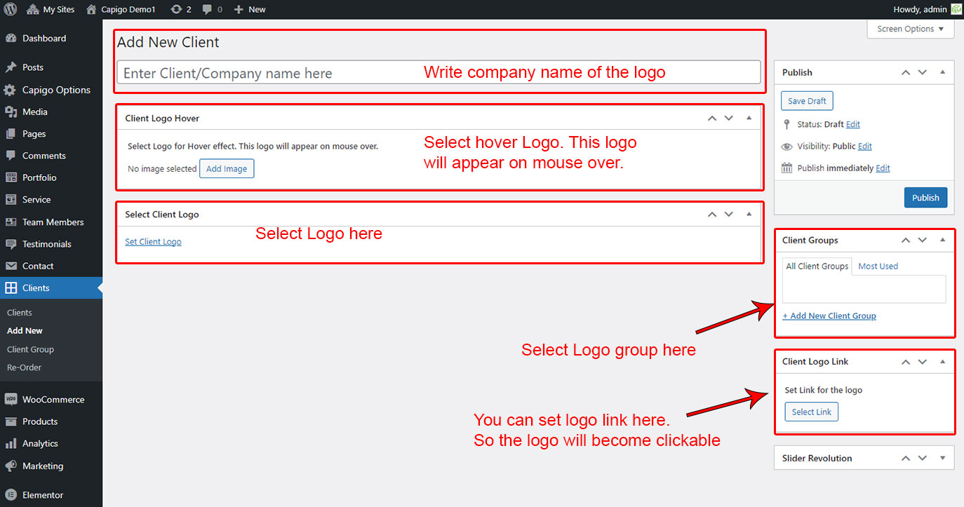 This will add a new logo. Repeat this steps and add some 3 or 6 client logo posts with the steps described above.